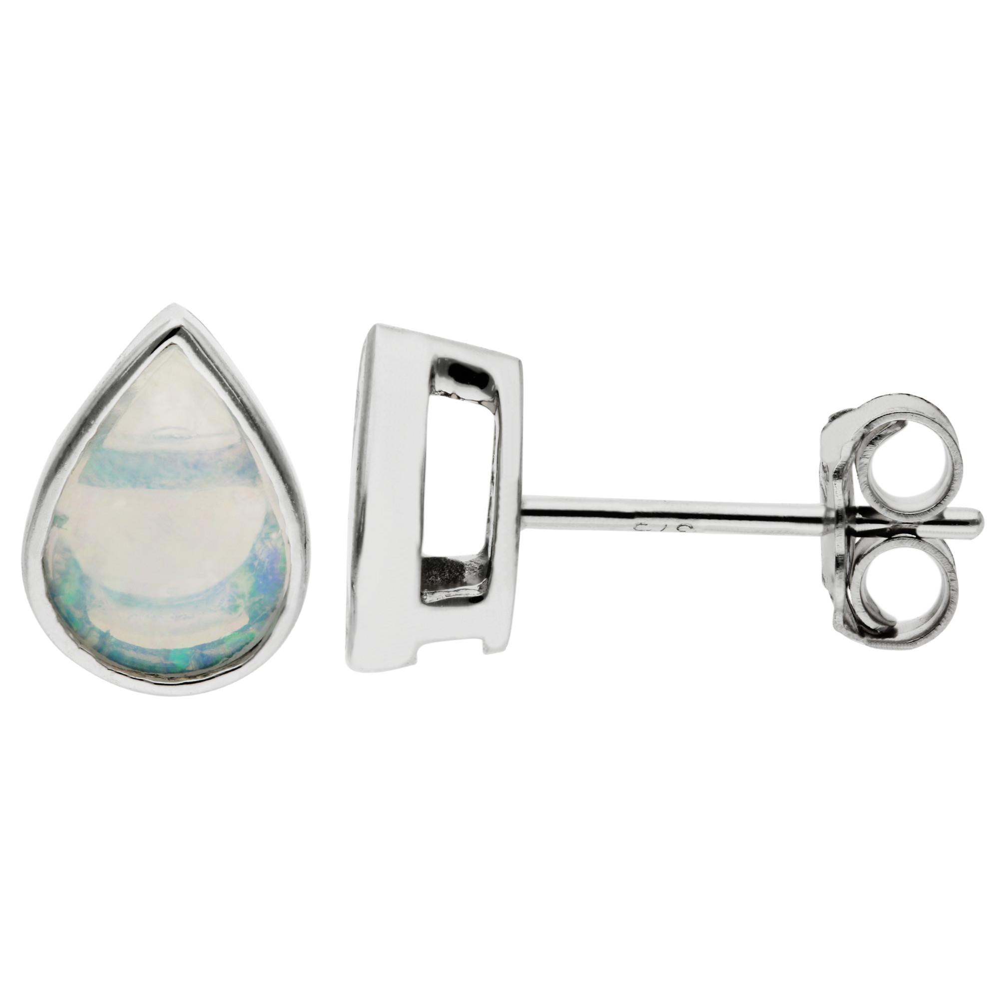Elevate your jewellery collection with these exquisite 9ct white gold women's earrings, featuring a total of 0.70ct pear shaped cabochon opals. Each earring showcases a stunning opal, beautifully bezel set in luxurious white gold, creating a captivating and elegant look. Designed as stud earrings with secure posts and scroll backs, they offer both comfort and stability for all-day wear. Perfect for any occasion, these opal earrings add a touch of sophistication and timeless beauty to your ensemble. The iridescent opals combined with sleek white gold make these earrings a truly enchanting addition to any collection.