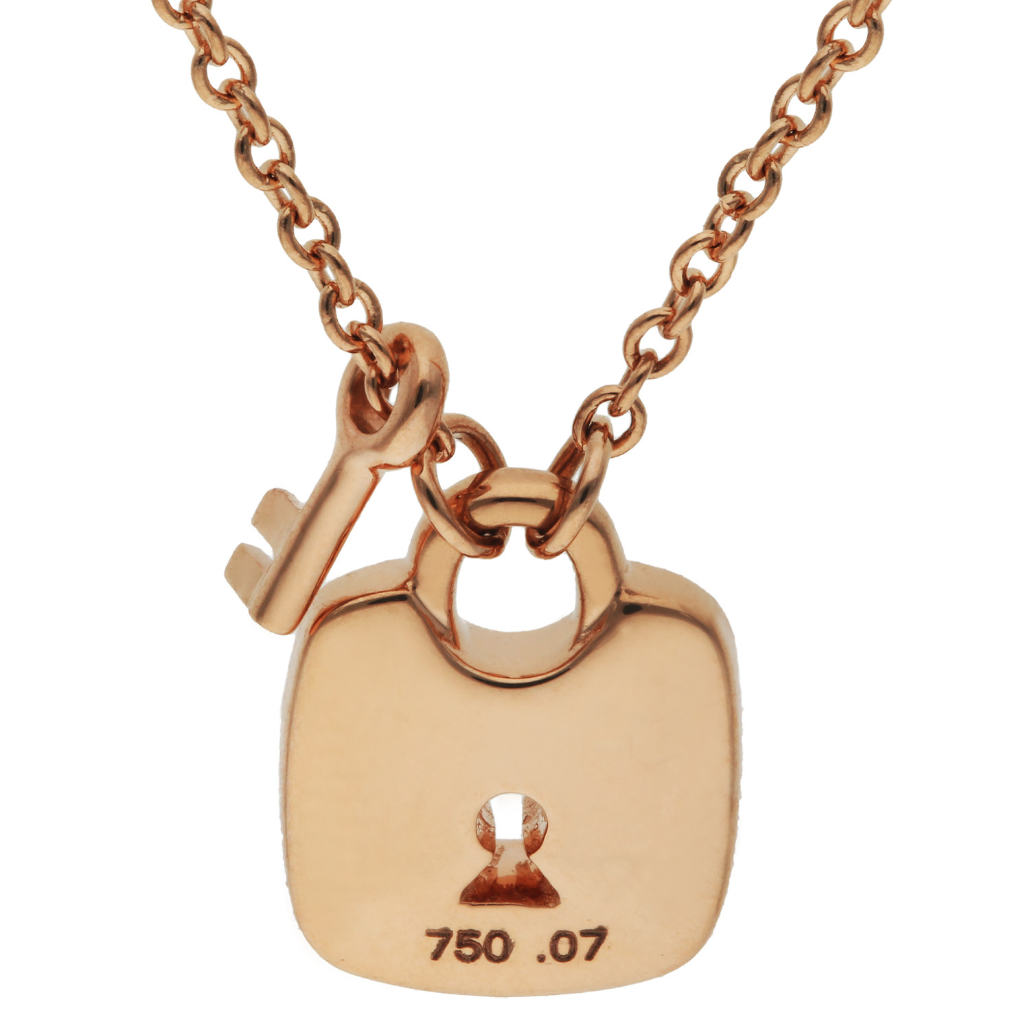 This elegant 18ct rose gold pendant features a beautifully crafted padlock design, adorned with tiny sparkling diamonds. The warm hue of the rose gold is perfectly complemented by the brilliance of the diamonds, creating a luxurious and timeless piece. Accompanied by a charming rose gold key, this pendant symbolises love and security, making it both meaningful and stylish. Complete with an integral rose gold chain, this pendant sits gracefully on the neckline, perfect for adding a touch of elegance to any outfit. Ideal as a thoughtful gift or a treasured addition to your jewellery collection, this diamond padlock pendant exudes charm and sophistication.
