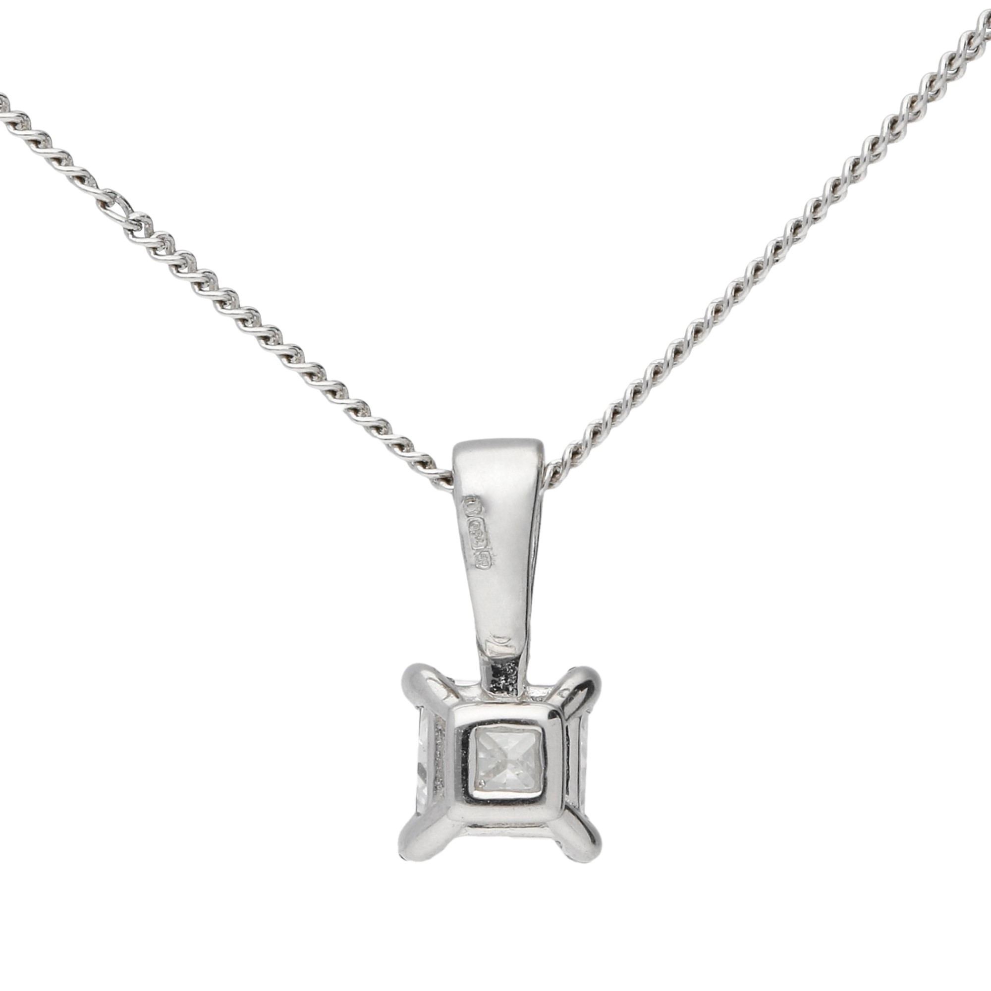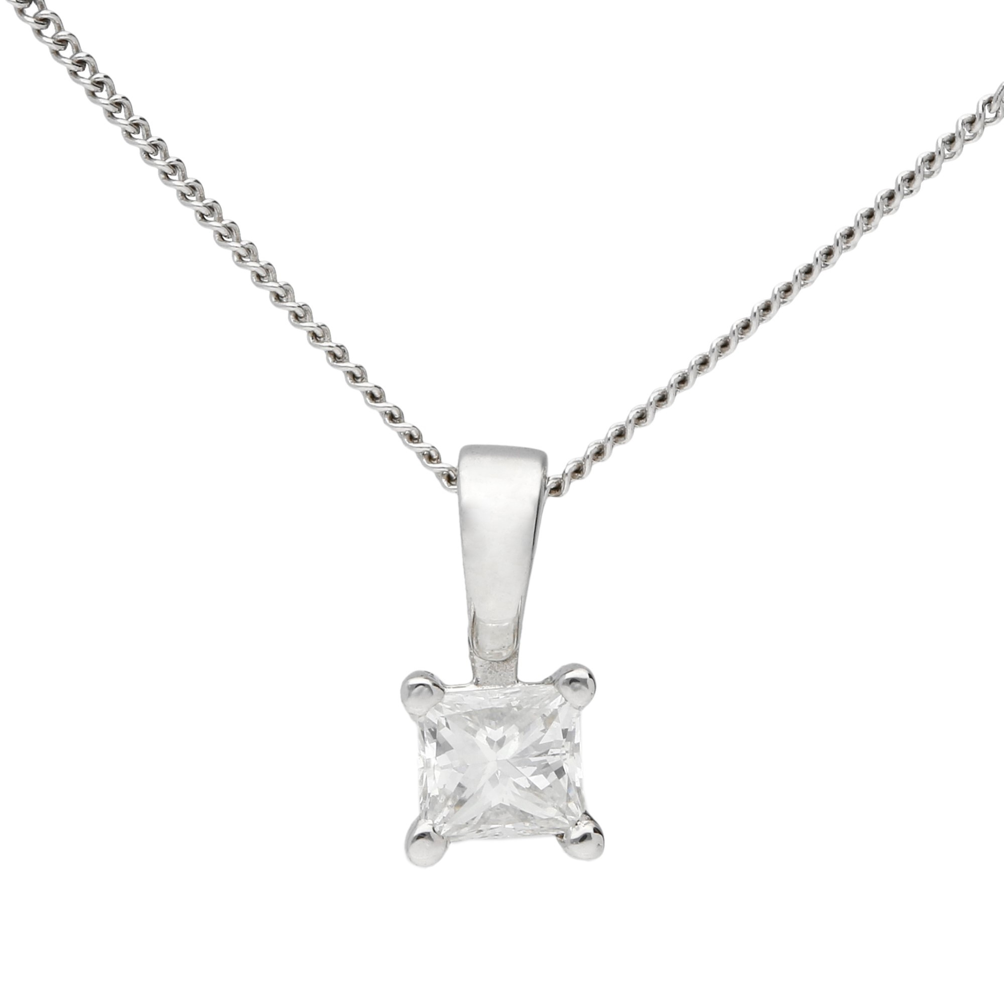 Introducing our elegant 18ct white gold pendant, featuring a pristine 0.25ct princess-cut diamond. This beautifully claw-set diamond radiates brilliance and clarity, perfectly framed by the sleek white gold setting. The pendant is held securely on a polished, fixed bail that enhances the gemstone's visibility and sparkle. Accompanied by a delicate white gold chain, this pendant promises to add a touch of sophistication to any outfit, making it an ideal choice for both everyday elegance and special occasions. It’s the perfect gift for celebrating milestones or as a cherished addition to your jewellery collection, offering timeless appeal and refined luxury.