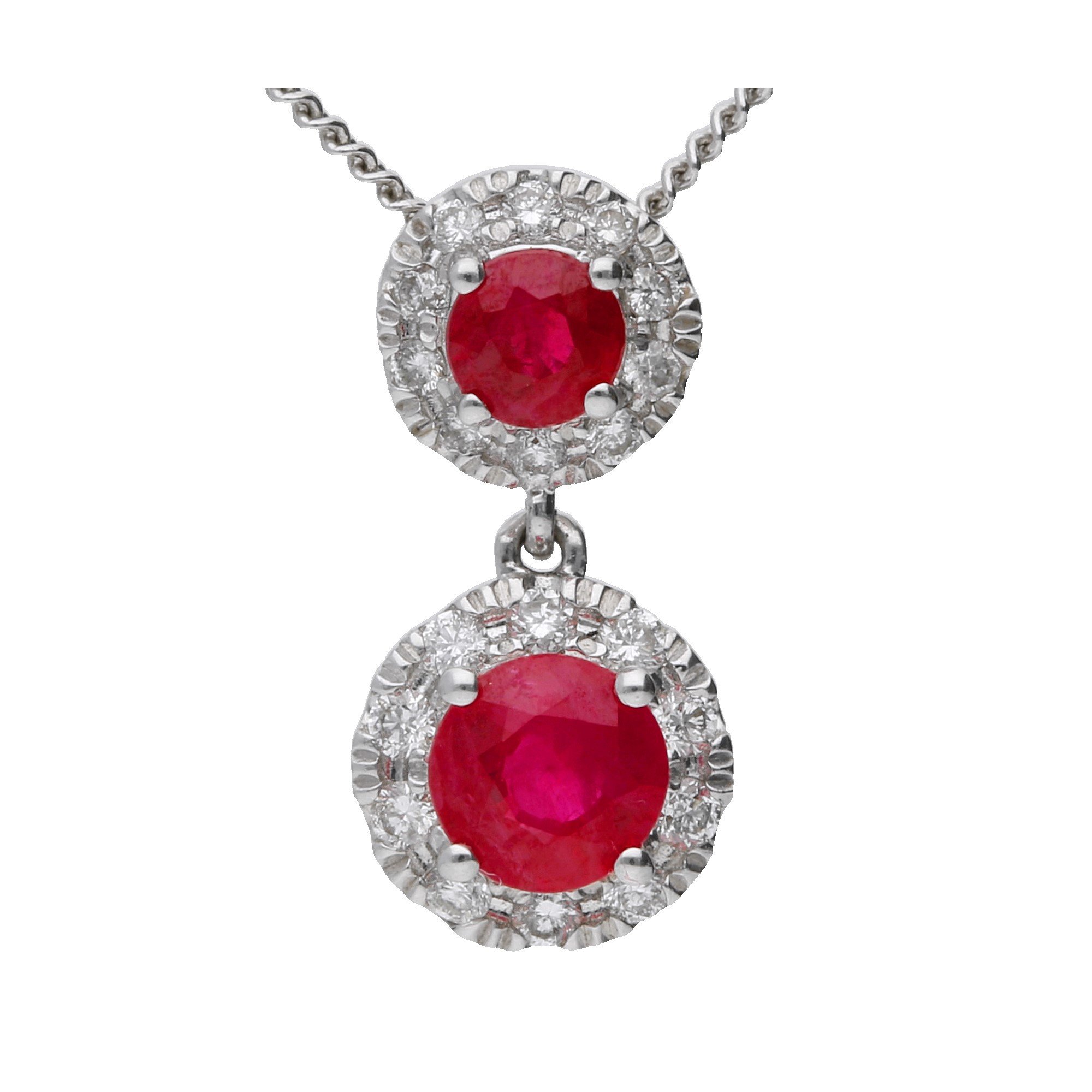Add a touch of elegance to your jewellery collection with this stunning ruby and diamond pendant. Shop now and experience the perfect blend of beauty and sophistication with this luxurious 18ct white gold double cluster pendant.