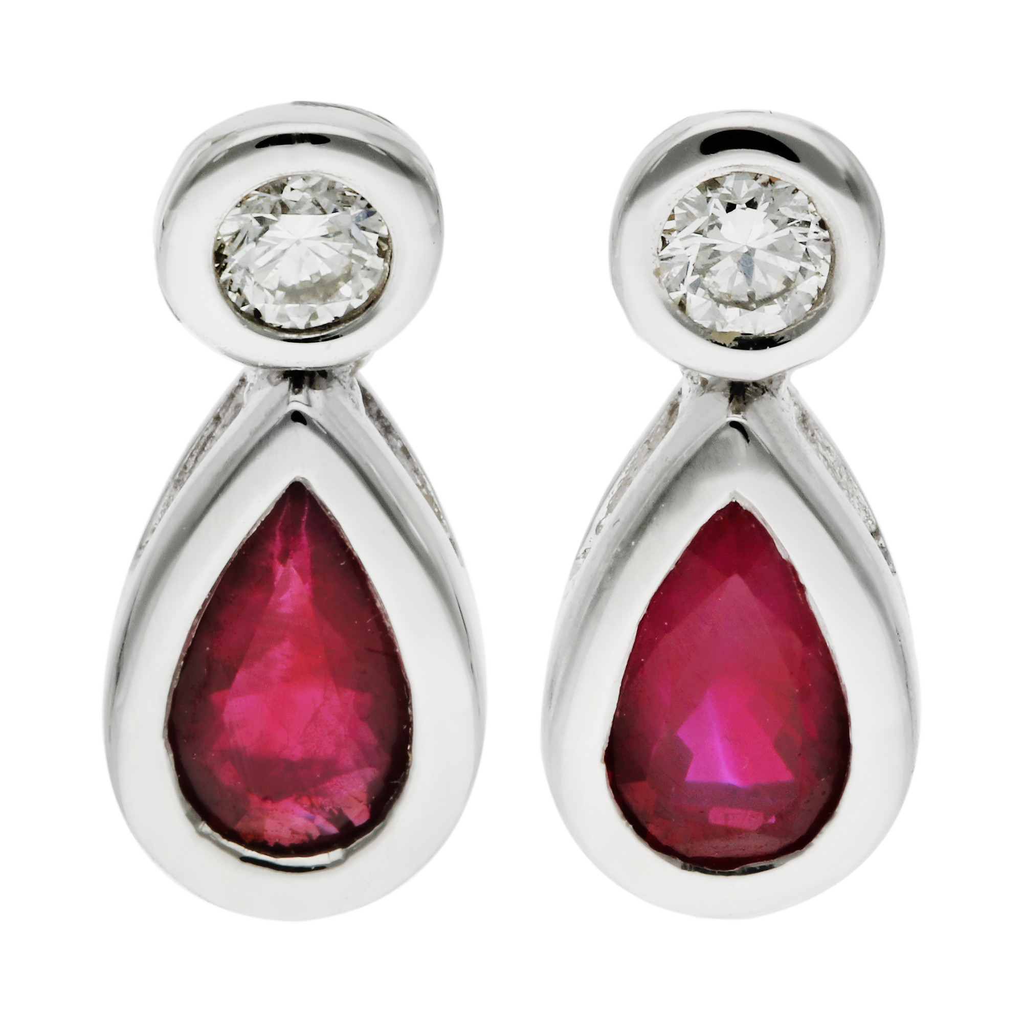 Elevate your style with our exquisite 18ct White Gold Diamond & 0.45ct Ruby Earrings. Each earring showcases a vibrant 0.45ct pear shaped ruby, delicately suspended beneath a dazzling round brilliant cut diamond. Both the ruby and diamond are expertly bezel set in lustrous white gold, ensuring both security and an elegant finish. Designed with posts and scroll backs for comfort and stability, these earrings are perfect for adding a splash of colour and luxury to any outfit. The rich red of the ruby paired with the brilliant sparkle of the diamond makes these earrings a stunning choice for special occasions or as a glamorous daily accessory. Indulge in this timeless piece of fine jewellery, ideal for those who seek sophistication and a touch of classic glamour.
