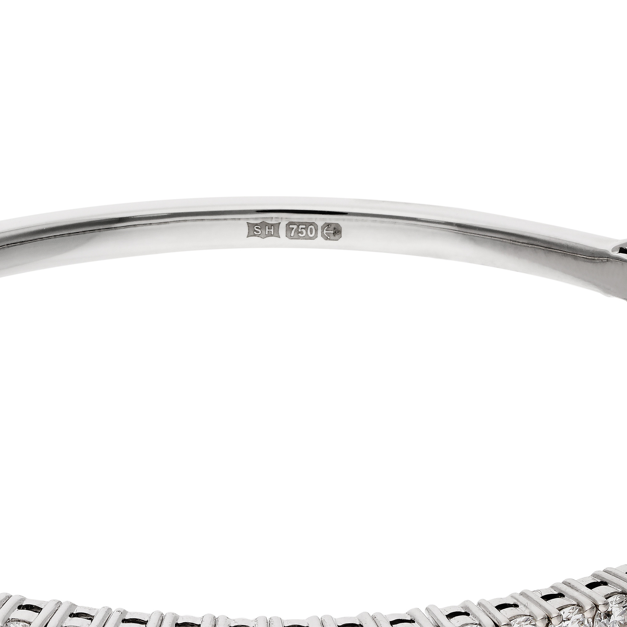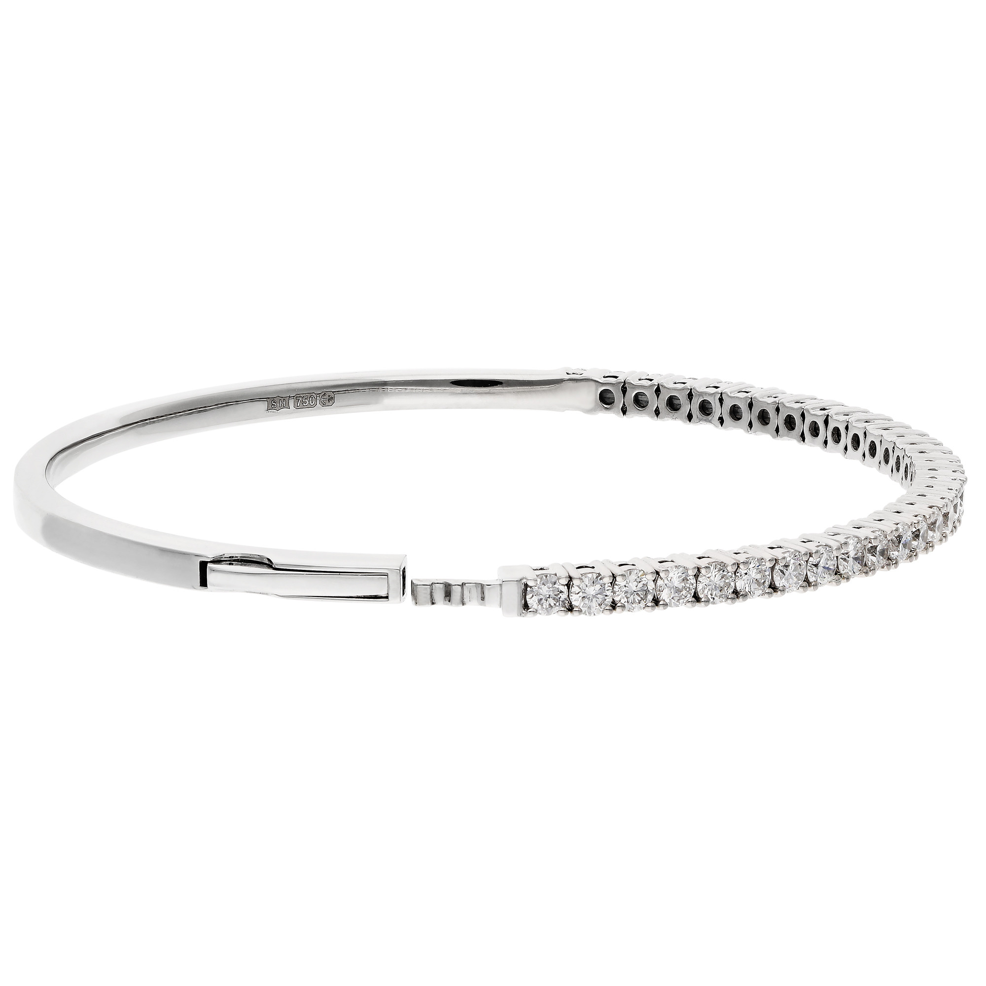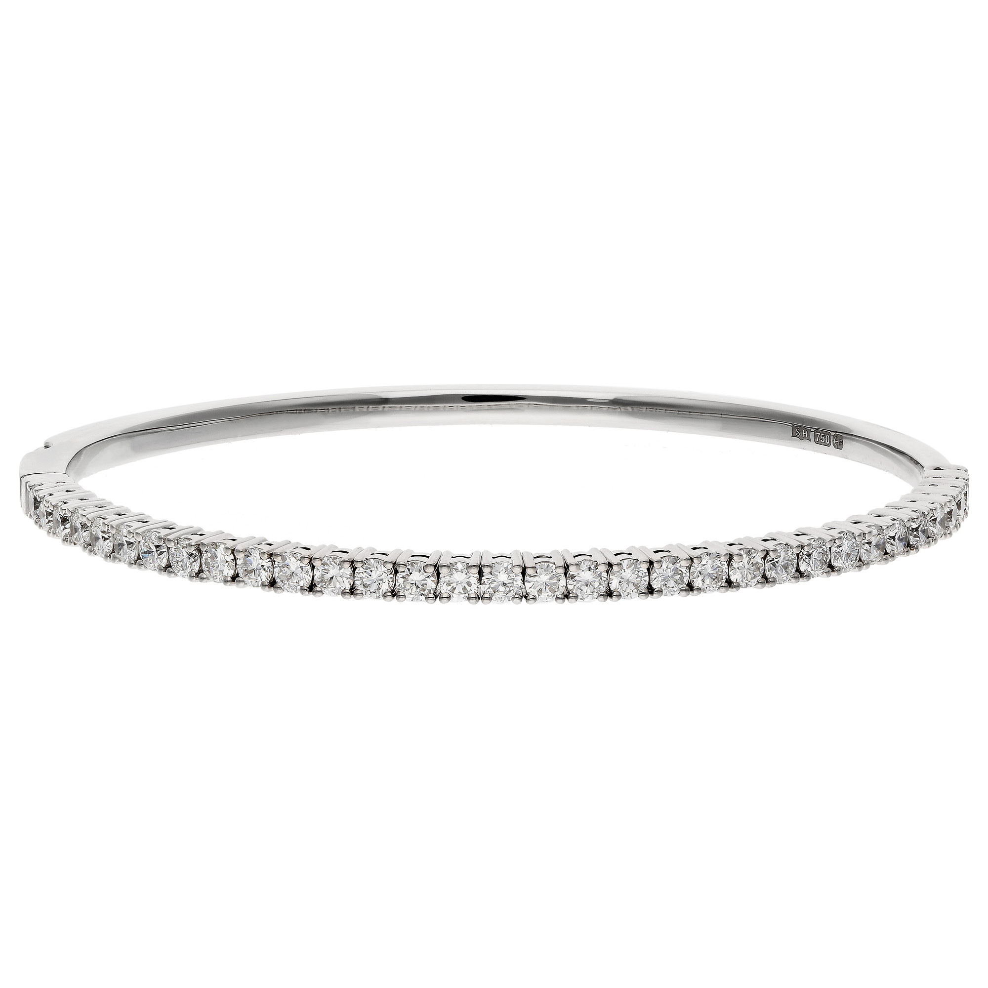 This elegant 18ct white gold bangle features 2.13 carats of round brilliant cut natural diamonds, beautifully claw set across the top half to create a continuous sparkle that catches the light from every angle. Expertly crafted with a flexible clasp, the design allows for gentle expansion, ensuring a comfortable fit while maintaining a sleek, polished look. The smooth white gold finish complements the brilliance of the diamonds, creating a sophisticated piece that balances classic elegance with modern practicality. Perfect for both everyday wear and special occasions, this bangle adds a touch of refined luxury to any outfit. Whether chosen as a personal indulgence or a meaningful gift, it is ideal for birthdays, anniversaries, or other significant milestones. A timeless addition to any jewellery collection, this bangle exemplifies the beauty of natural diamonds combined with expert craftsmanship, offering enduring style and sparkle that will be cherished for years to come.