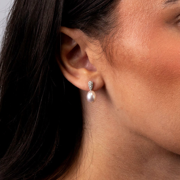 These drop earrings are crafted with posts and scroll backs, ensuring both comfort and security for all-day wear. The combination of sparkling diamonds and soft white pearls makes them perfect for both casual and formal occasions, offering a versatile option for any outfit.