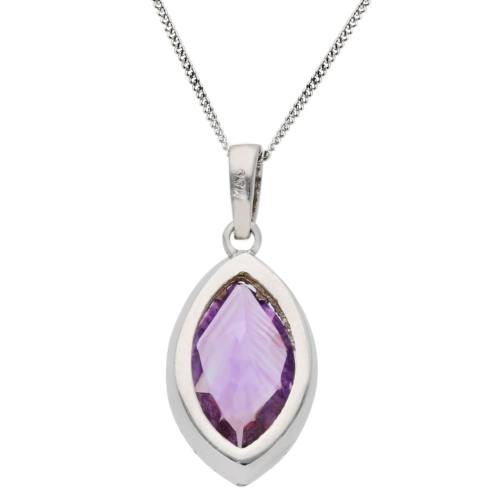 This stunning 18ct white gold pendant features a 1.50ct marquise cut amethyst, beautifully framed by a halo of sparkling diamonds. The rich purple hue of the amethyst is perfectly complemented by the brilliance of the diamonds, creating an elegant and sophisticated design. The pendant is suspended from a polished white gold bail, offering a sleek and modern finish. Complete with a matching white gold chain, this pendant is perfect for adding a touch of luxury to both everyday outfits and special occasions. Ideal as a gift or a personal indulgence, this amethyst and diamond pendant is a timeless addition to any jewellery collection.