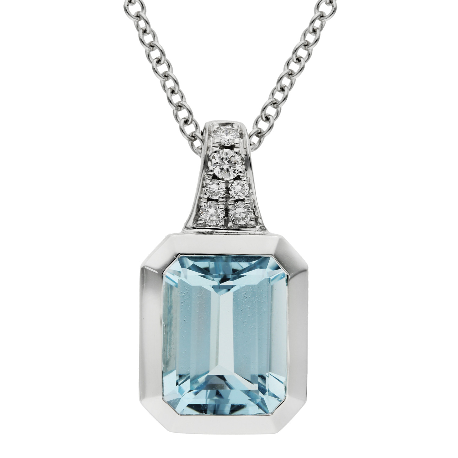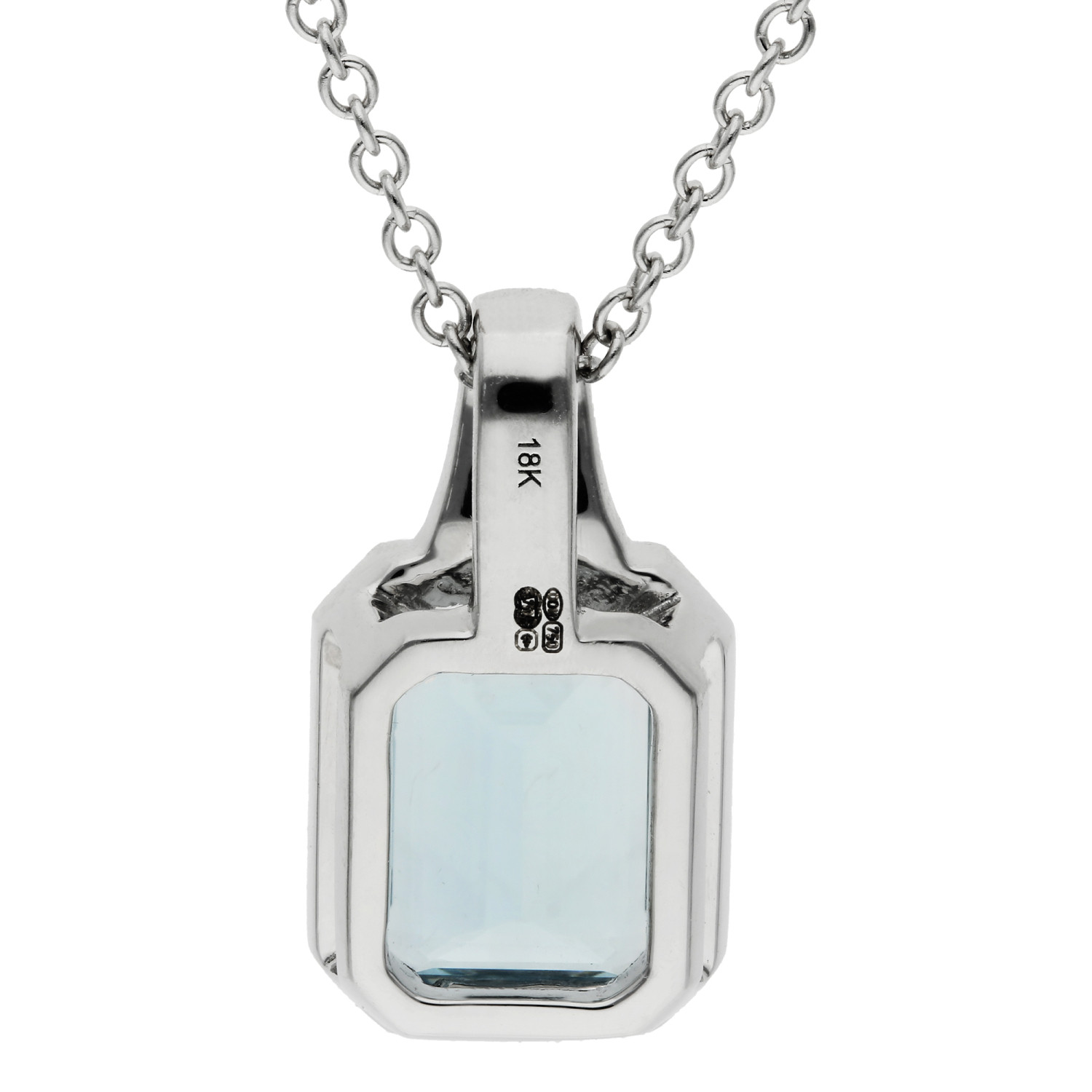 This exquisite 18ct white gold pendant features a stunning 2.00ct rectangular cut aquamarine, beautifully bezel set to showcase its soft blue hue. The aquamarine is suspended from a diamond set fixed bail, adding a touch of sparkle and elegance to the design. The sleek white gold complements the cool tones of the aquamarine, making this pendant perfect for any occasion. Complete with a matching white gold chain, this piece exudes sophistication and timeless style. Ideal as a gift or as a personal addition to your jewellery collection, this aquamarine and diamond pendant will make a lasting impression.