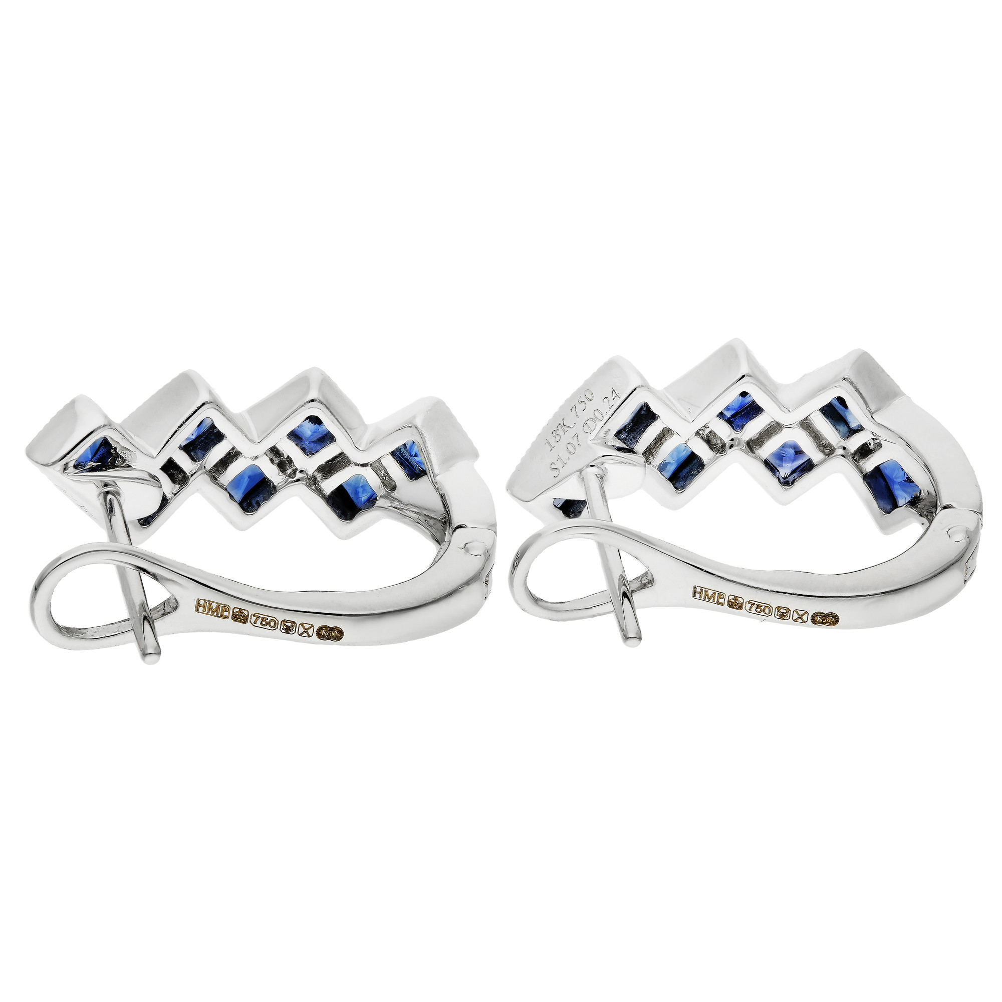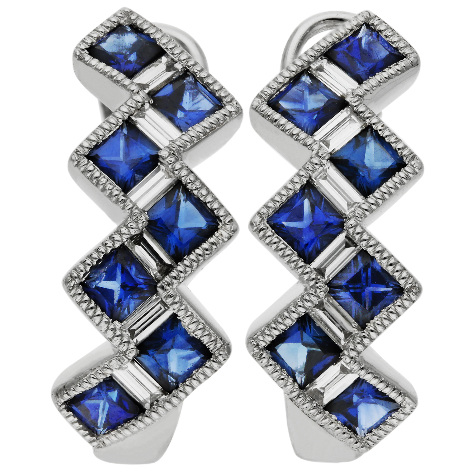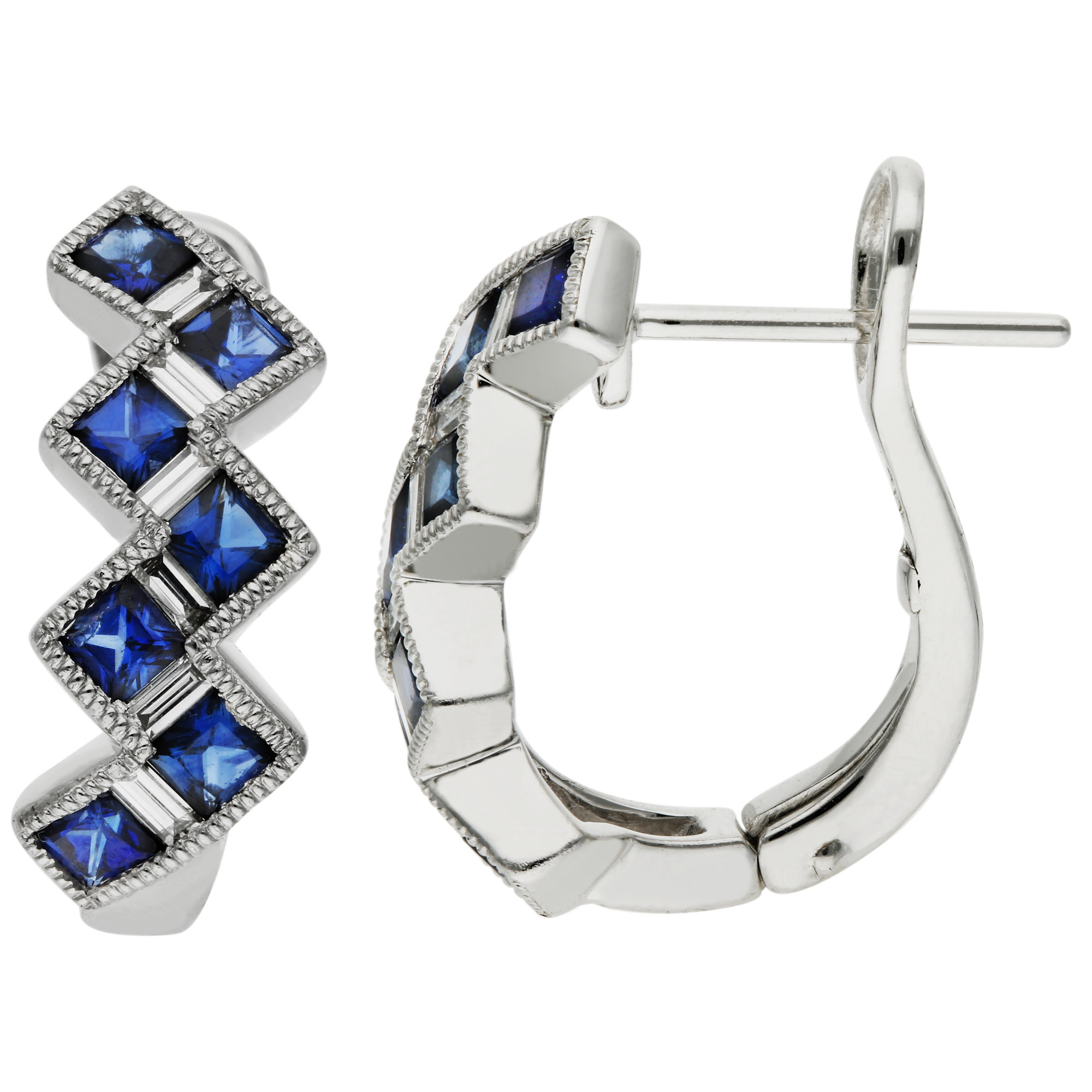 Elevate your jewellery collection with our exquisite 18ct white gold hoop earrings, featuring a striking combination of 1.07ct square cut sapphires and baguette cut diamonds. Each earring showcases a unique zigzag formation, artfully set to enhance the intense blue of the sapphires and the sparkling clarity of the diamonds. The millegrain edging adds a touch of vintage elegance, refining the overall design. These hinged hoop earrings ensure a secure and comfortable fit, making them perfect for daily wear or special occasions. With their sophisticated styling and luxurious materials, these earrings are sure to captivate and charm, offering timeless beauty to any outfit.