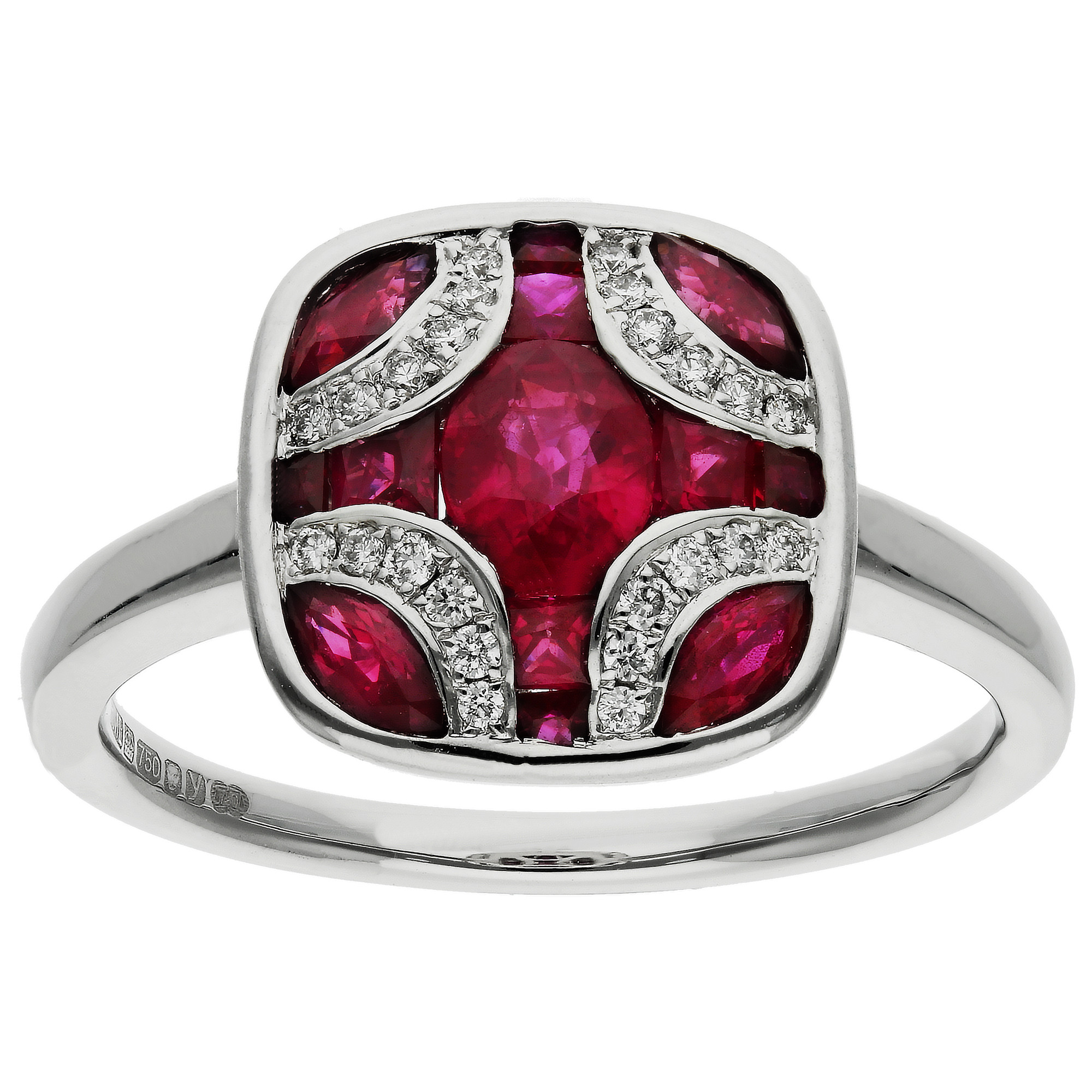 Discover the allure of this 18ct White Gold Diamond and 1.11ct Ruby Ring, a sophisticated statement piece crafted for those who appreciate luxurious design. At the heart of this ring lies an exquisite arrangement of rubies in various shapes, creating a striking rectangular shield motif. Surrounding the rubies are round brilliant cut diamonds, each adding a touch of sparkle to highlight the deep red hues. Mounted in white gold, the shield design sits elegantly on a polished band, creating a seamless blend of classic and contemporary style. Perfect for adding a refined touch to any ensemble, this ring makes a meaningful gift or an indulgent addition to your own jewellery collection.