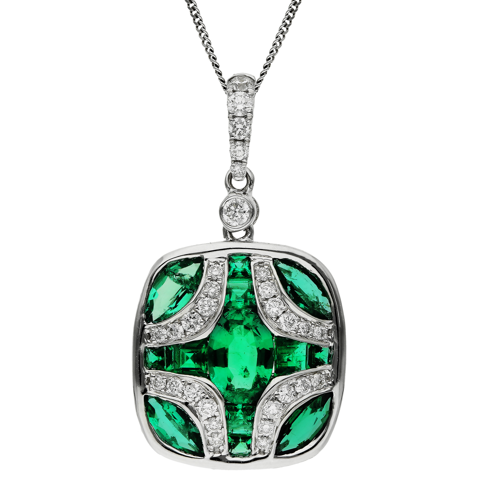 Discover the timeless elegance of our 18ct white gold emerald and diamond pendant. This exquisite piece features a beautifully graduated diamond set bail that flows seamlessly into a luxurious shield design. The shield is adorned with a stunning array of marquise, oval, and square cut emeralds, each bezel set in pristine white gold. The emeralds are complemented by curves of Pavé set diamonds that highlight each corner, enhancing the pendant's overall brilliance. Complete with a chain, available in various lengths from the drop down menu, this pendant offers versatility and grace, making it the perfect accessory for any occasion where style and sophistication are desired.