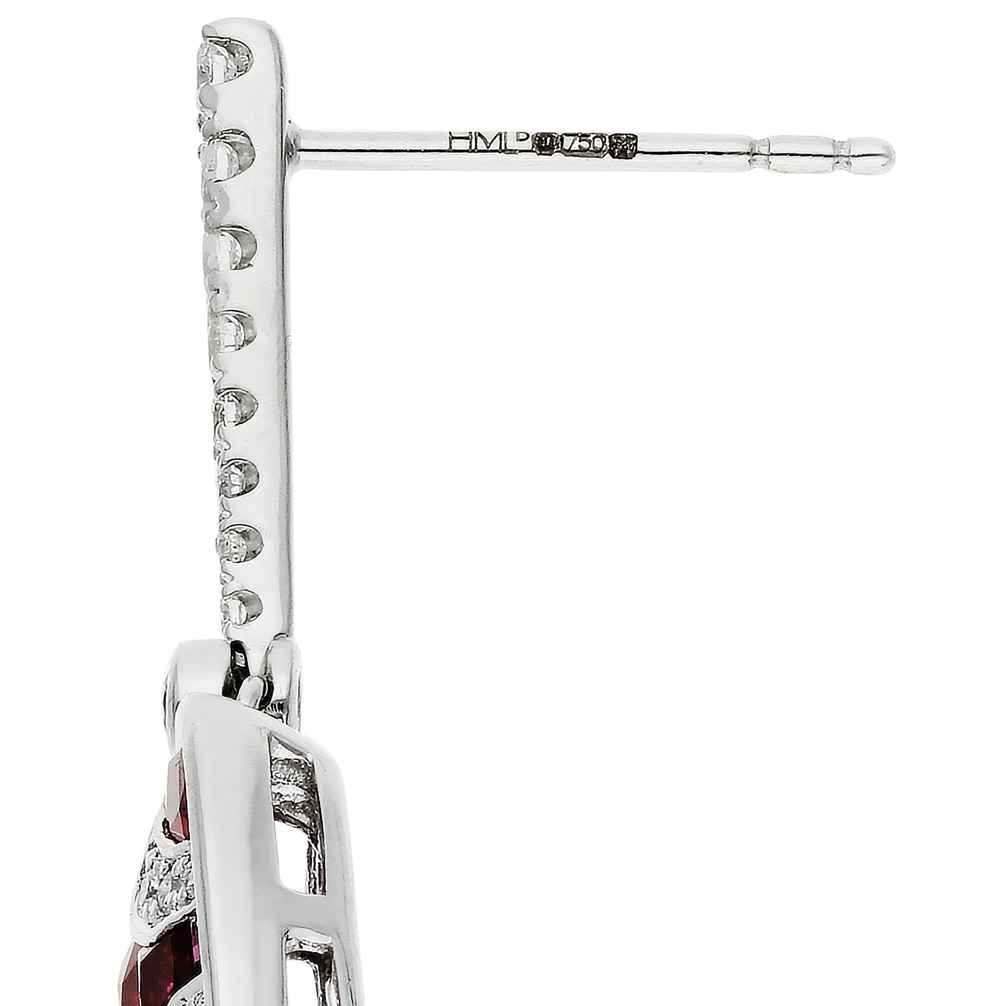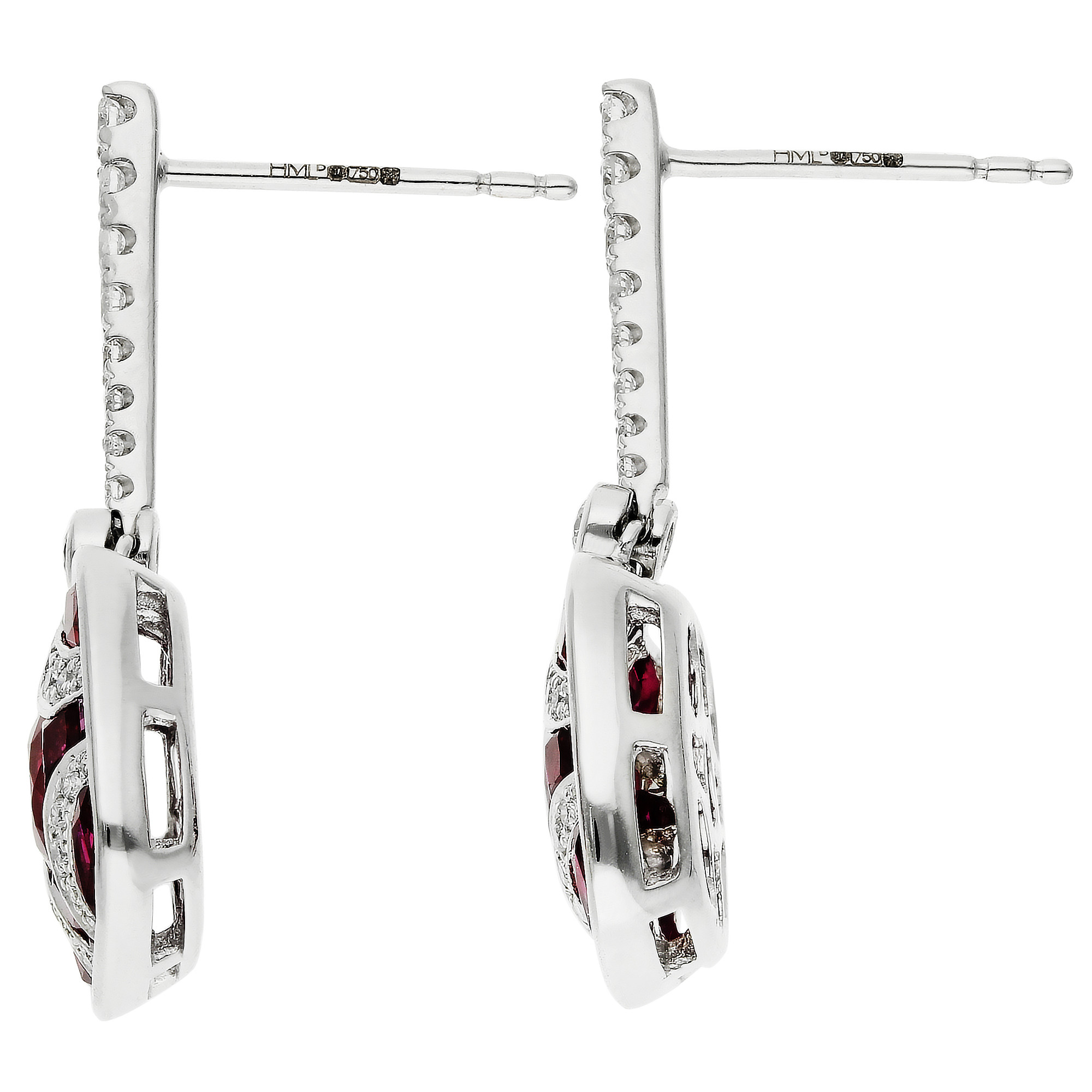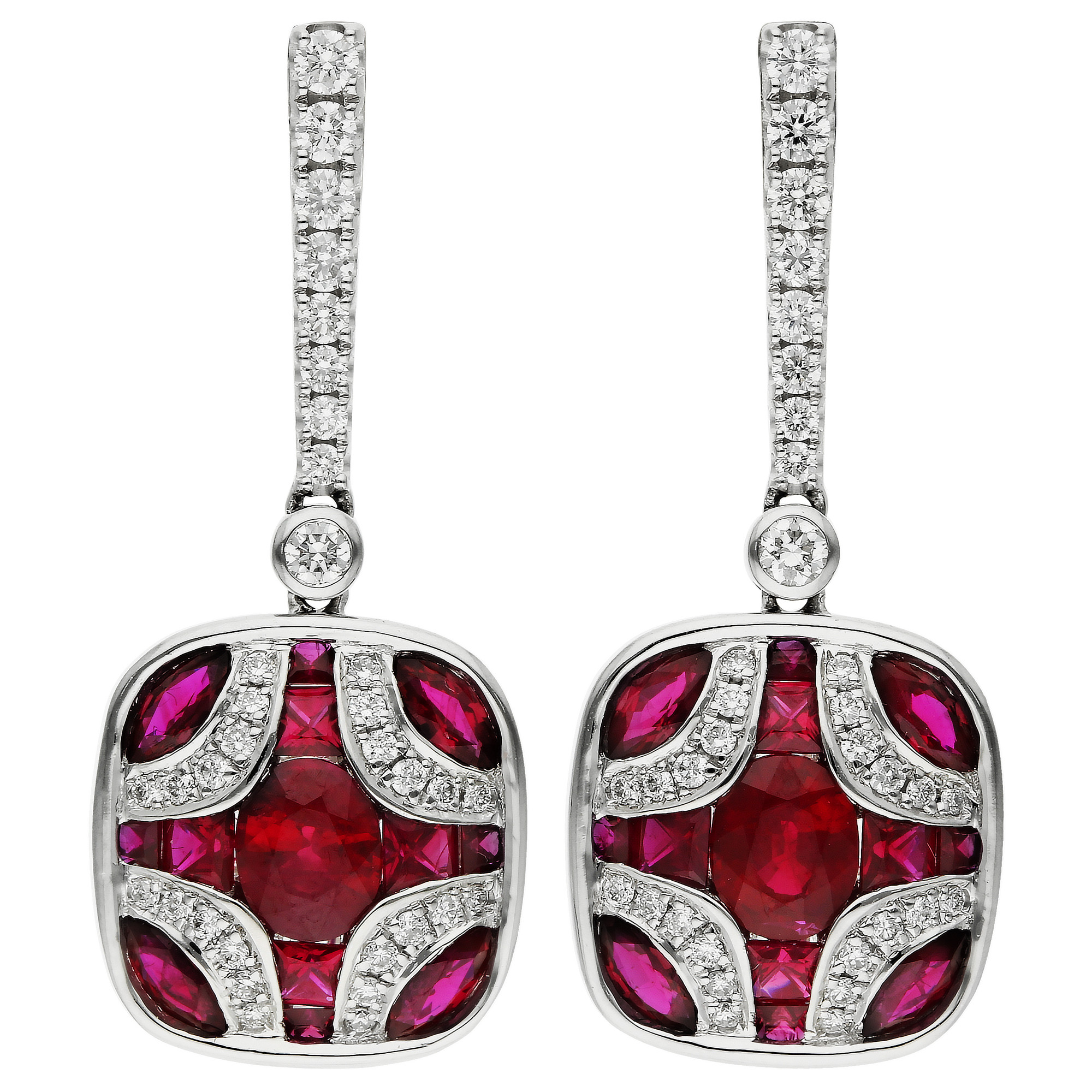 Elevate your evening attire with our stunning 18ct white gold ruby and diamond drop earrings. Each earring features a graceful graduated bar of sparkling diamonds, seamlessly transitioning into a luxurious shield design at the base. This shield is intricately set with a collection of marquise, oval, and square cut rubies, each bezel set in gleaming white gold. Enhancing the vibrant red of the rubies, curves of Pavé set diamonds adorn each corner, providing a dazzling finish. These earrings are equipped with posts and scroll backs for secure and comfortable wear, making them an impeccable choice for sophisticated gatherings and special occasions. Add these exquisite earrings to your collection for a touch of glamour and timeless elegance.