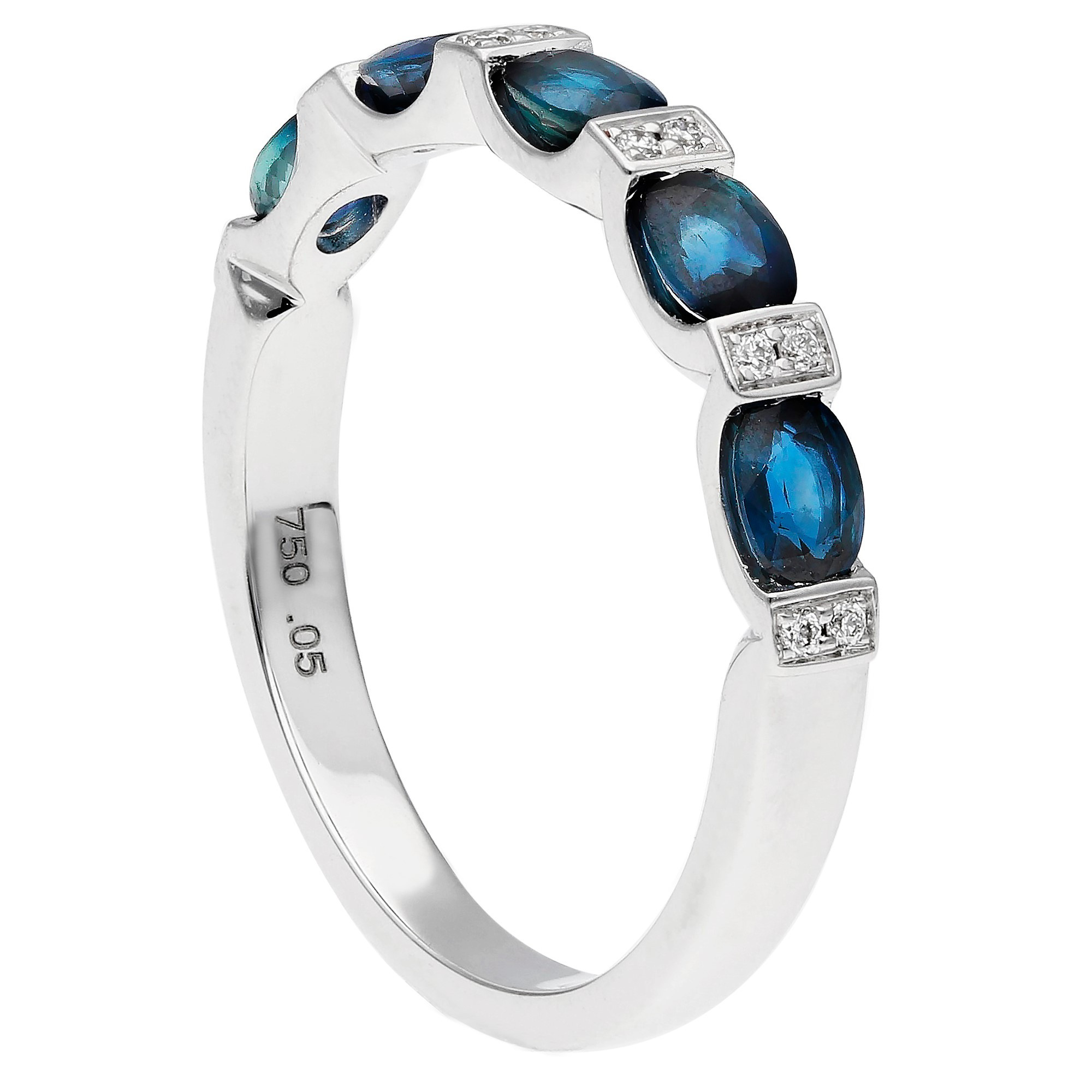 A delicious sapphire and diamond half eternity ring crafted in 18ct white gold and set with oval blue sapphires alternately placed with diamond set rectangles of white gold. A gorgeous love token or a perfect adornment for everyday elegance.