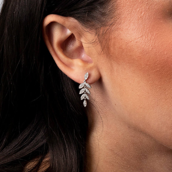 "Introducing our exquisite 18ct White Gold Diamond Barleycorn Leaf Drop Earrings, a masterpiece of nature-inspired elegance and fine craftsmanship. Each earring is delicately composed of three graduated pairs of leaves, intricately designed to capture the essence of a barleycorn. Adding to this natural motif, a single leaf adorns both the top and bottom, completing the design with a harmonious balance. Each leaf is beautifully crafted in lustrous 18-carat white gold and is embellished with sparkling diamonds, meticulously set to enhance the intricate details and create a captivating shimmer. The diamonds catch the light with every movement, echoing the gentle rustle of leaves in a serene breeze. These earrings gracefully combine the tranquillity of nature with luxurious sophistication, making them perfect for those who appreciate unique, elegant designs. Ideal for special occasions, these Diamond Barleycorn Leaf Drop Earrings are sure to make a sophisticated statement and become a cherished addition to any fine jewellery collection."