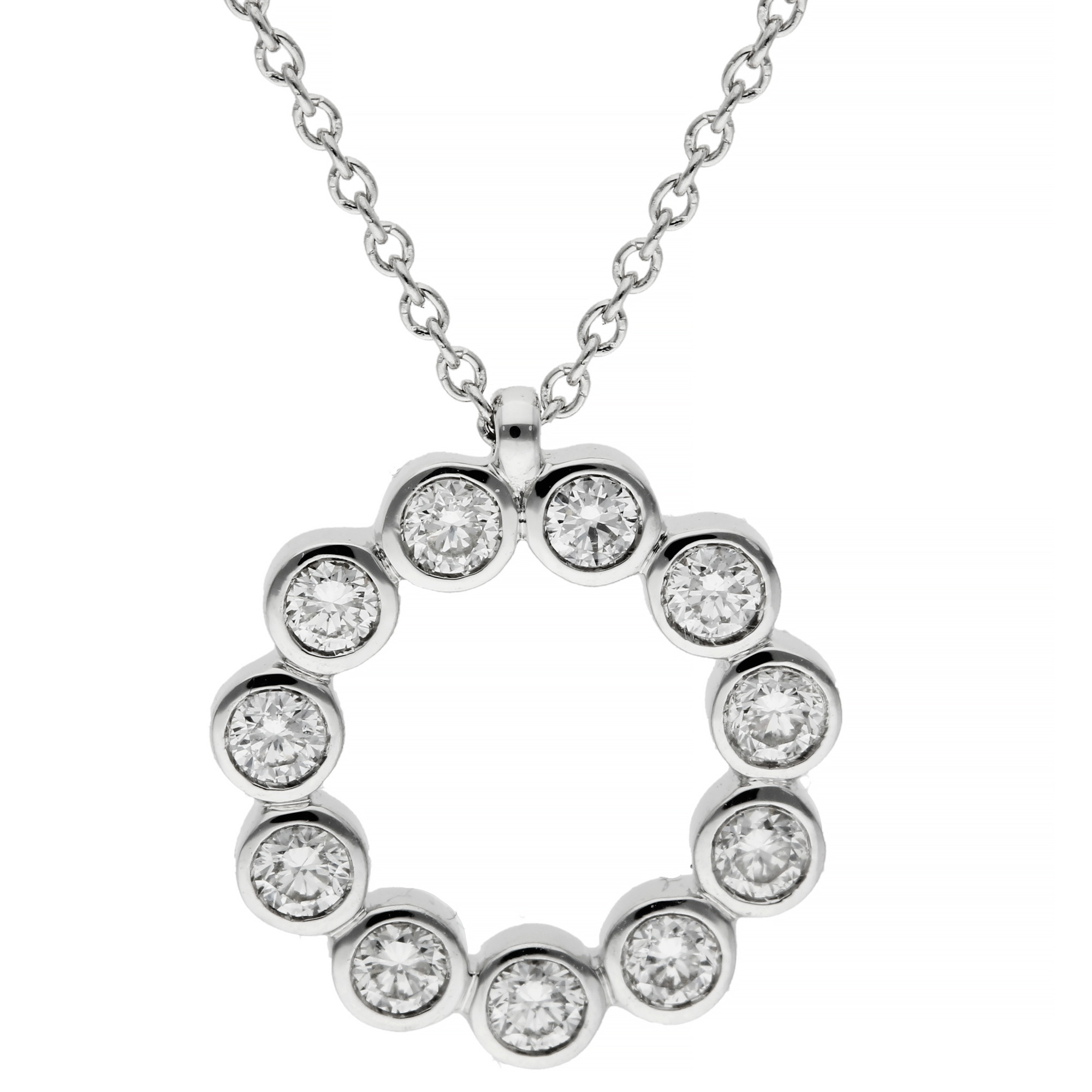 This exquisite 18ct white gold pendant features a circle of bezel set round brilliant cut diamonds, totalling 0.33ct. Each diamond is expertly positioned to create a stunning display of light and sparkle, offering a contemporary yet timeless design. The circle symbolises eternity, making this piece a meaningful addition to any jewellery collection. Complete with a matching white gold chain, this pendant sits elegantly on the neckline, perfect for both daily wear and special occasions. Whether as a thoughtful gift or a personal treat, this diamond pendant adds a touch of sophistication and brilliance to any ensemble.