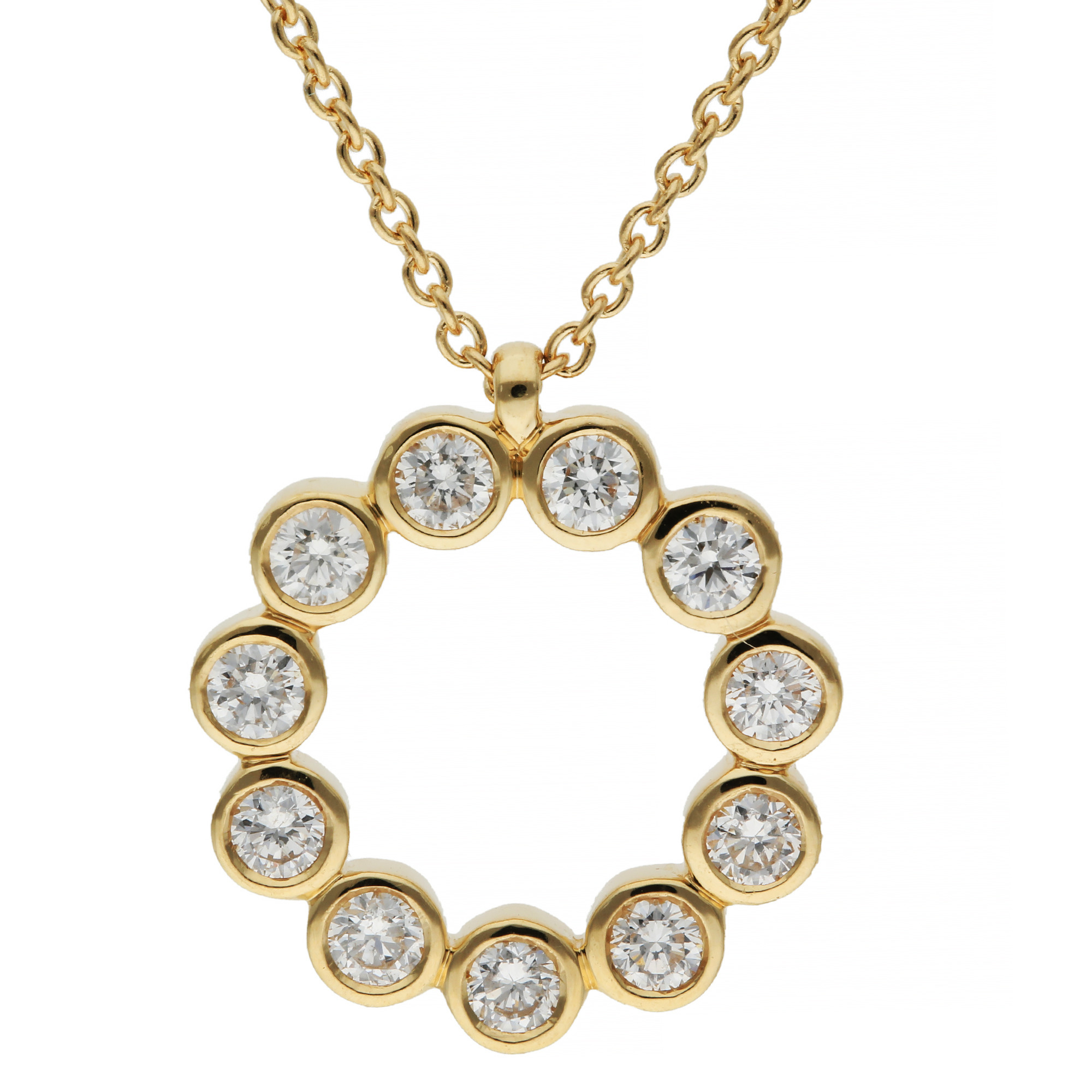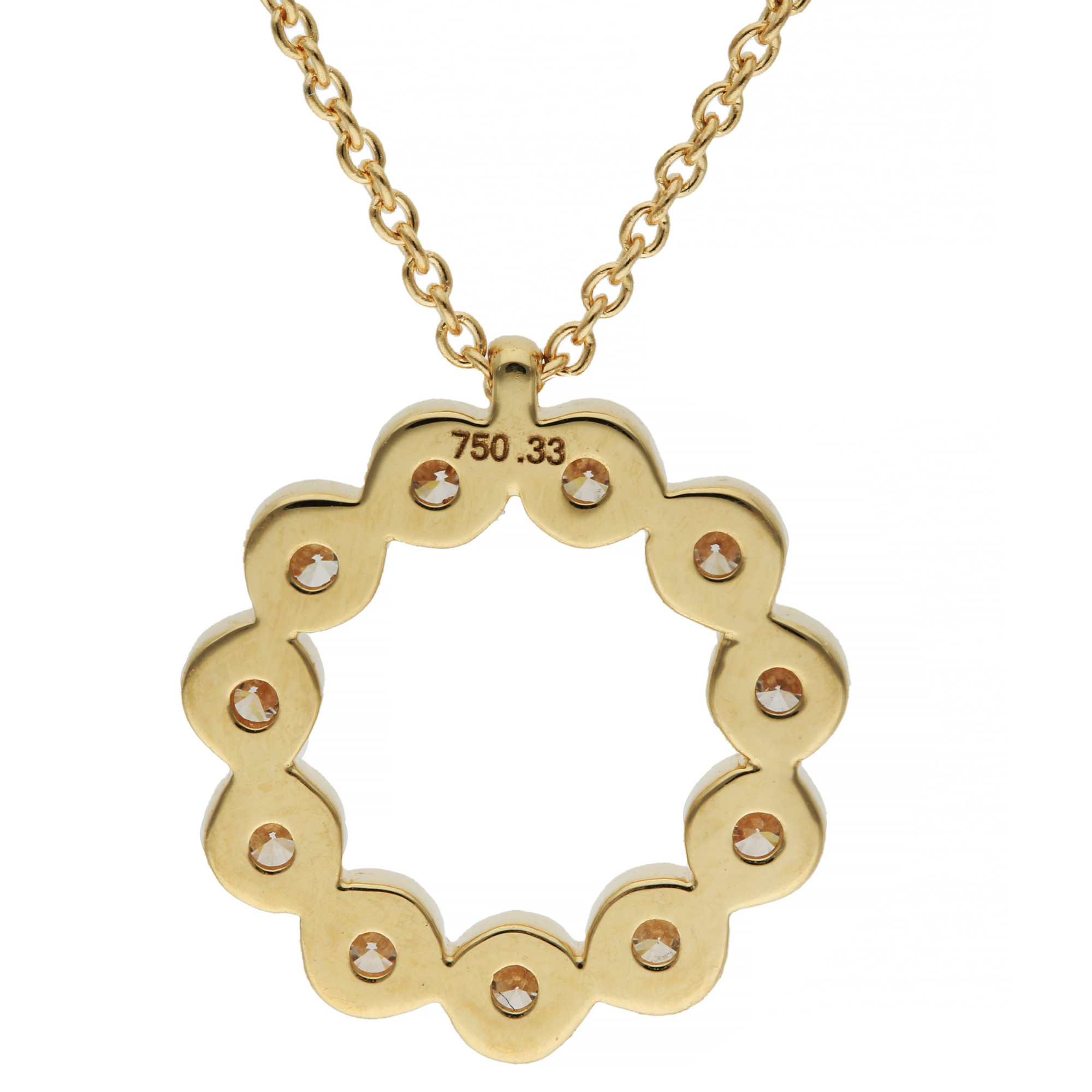 This elegant 18ct yellow gold pendant showcases a dazzling circle of round brilliant cut diamonds, totalling 0.33ct. Each diamond is bezel set to maximise its brilliance, creating a stunning display of sparkle and light. The circle design symbolises unity and eternity, making this pendant both meaningful and stylish. Complete with a matching yellow gold chain, it sits gracefully at the neckline, offering a refined touch to any outfit. Perfect for both special occasions and everyday elegance, this diamond pendant is an ideal gift or a timeless addition to your own jewellery collection.