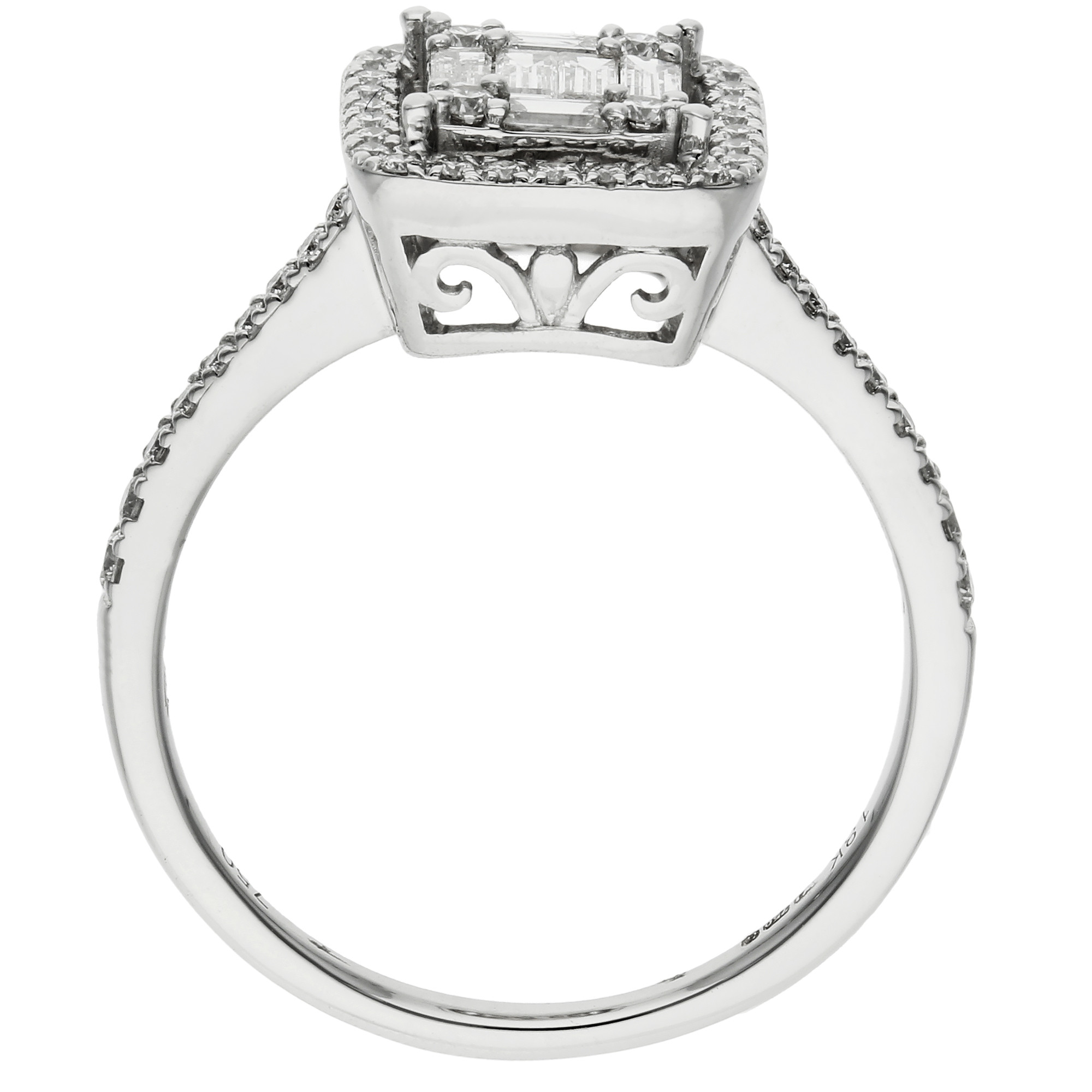Radiate elegance with this stunning 18ct White Gold Diamond Cluster Ring. At the heart of this exquisite design lies a captivating cluster of baguette and round brilliant cut diamonds, creating a dazzling centrepiece. The cluster is beautifully framed by a halo of tiny diamonds, enhancing the sparkle and brilliance of the ring.