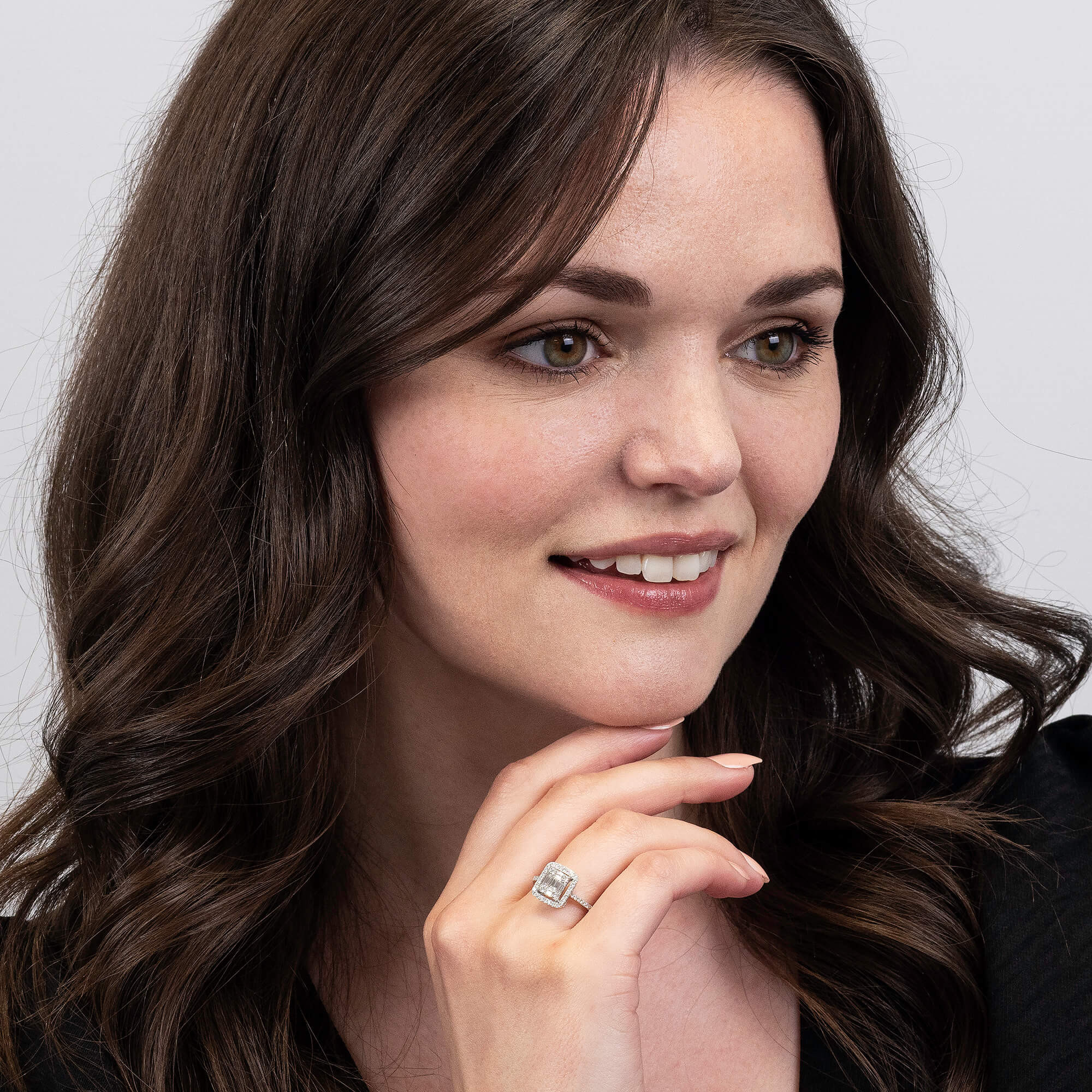 Crafted from luxurious 18ct white gold, this ring is further adorned with diamond set shoulders, adding an extra touch of glamour and sophistication. The combination of diamond cuts creates a dynamic interplay of light, making this piece perfect for anyone who loves timeless beauty with a modern twist.