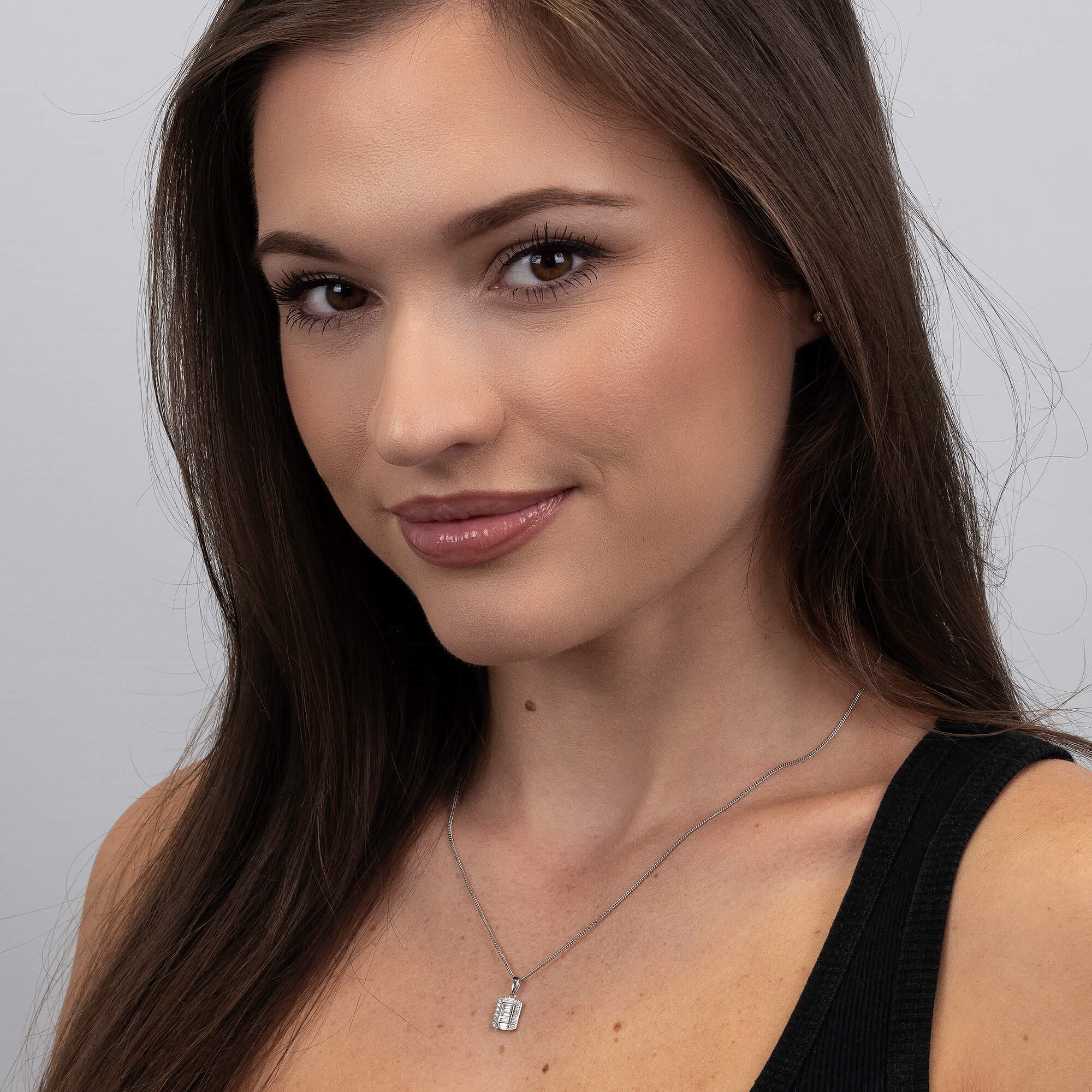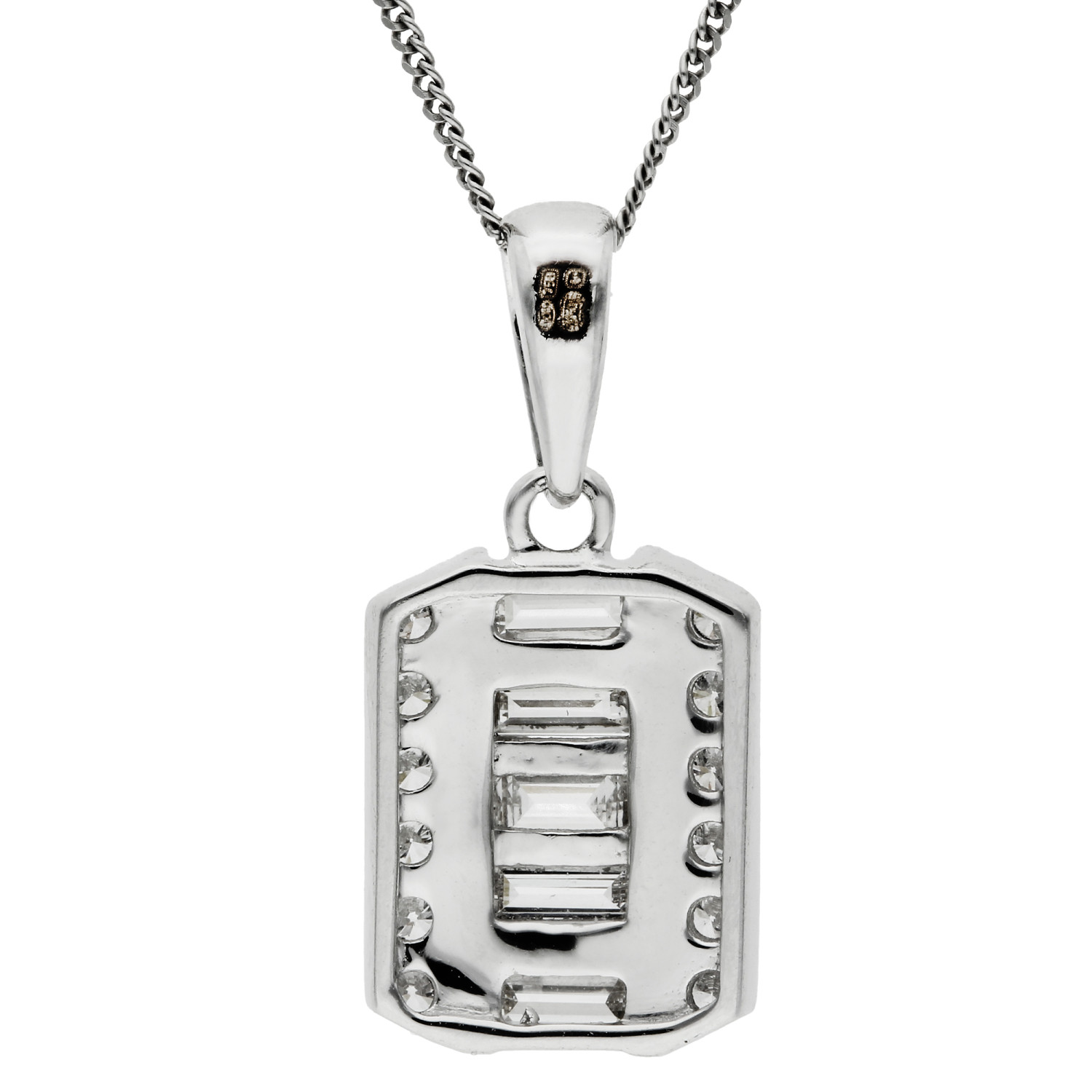 This stunning 18ct white gold pendant showcases a spectacular Deco inspired design, featuring an array of sparkling diamonds totalling 0.38ct. The rectangular channel and claw set diamonds create a dazzling geometric pattern, evoking the glamour of the Art Deco era. Crafted with meticulous attention to detail, this pendant is both elegant and timeless, making it a perfect choice for those who appreciate vintage-inspired luxury. Ideal as a gift for a diamond occasion or an April birthday, this eye catching piece is sure to impress. Its opulent design is complemented by a sleek white gold chain, offering a refined finish for any occasion.