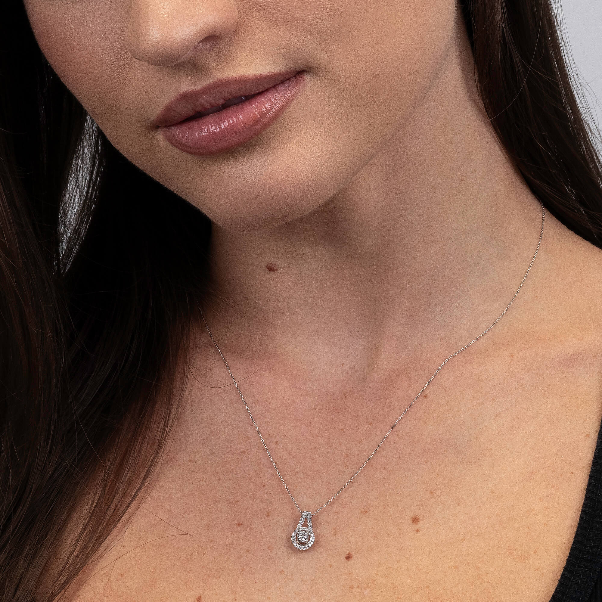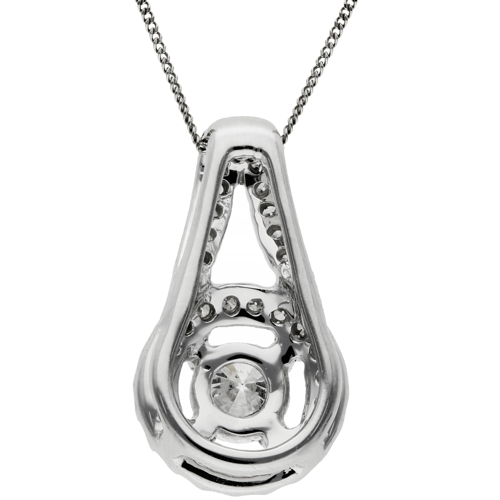 This stunning 18ct white gold pendant features a captivating 0.35ct claw set diamond, beautifully framed by a halo of smaller diamonds for added sparkle. The pendant is suspended from a diamond-encrusted split bail, creating an elegant and luxurious design. Complete with a matching white gold chain, this piece is perfect for adding a touch of glamour to any outfit. The combination of the central diamond and surrounding halo ensures a dazzling display of light with every movement. Ideal for special occasions or everyday wear, this diamond pendant is a timeless addition to any jewellery collection.