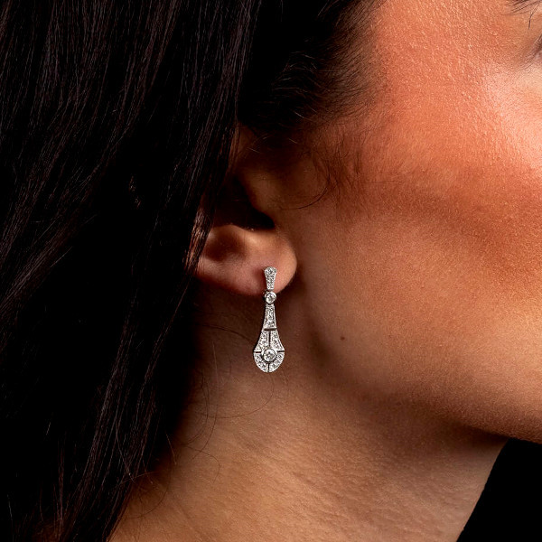 These earrings are designed with posts and scroll backs, ensuring a secure and comfortable fit, perfect for all-day wear. The unique Art Deco-inspired styling makes these earrings not only a testament to timeless design but also a versatile accessory suitable for both special occasions and everyday luxury.
