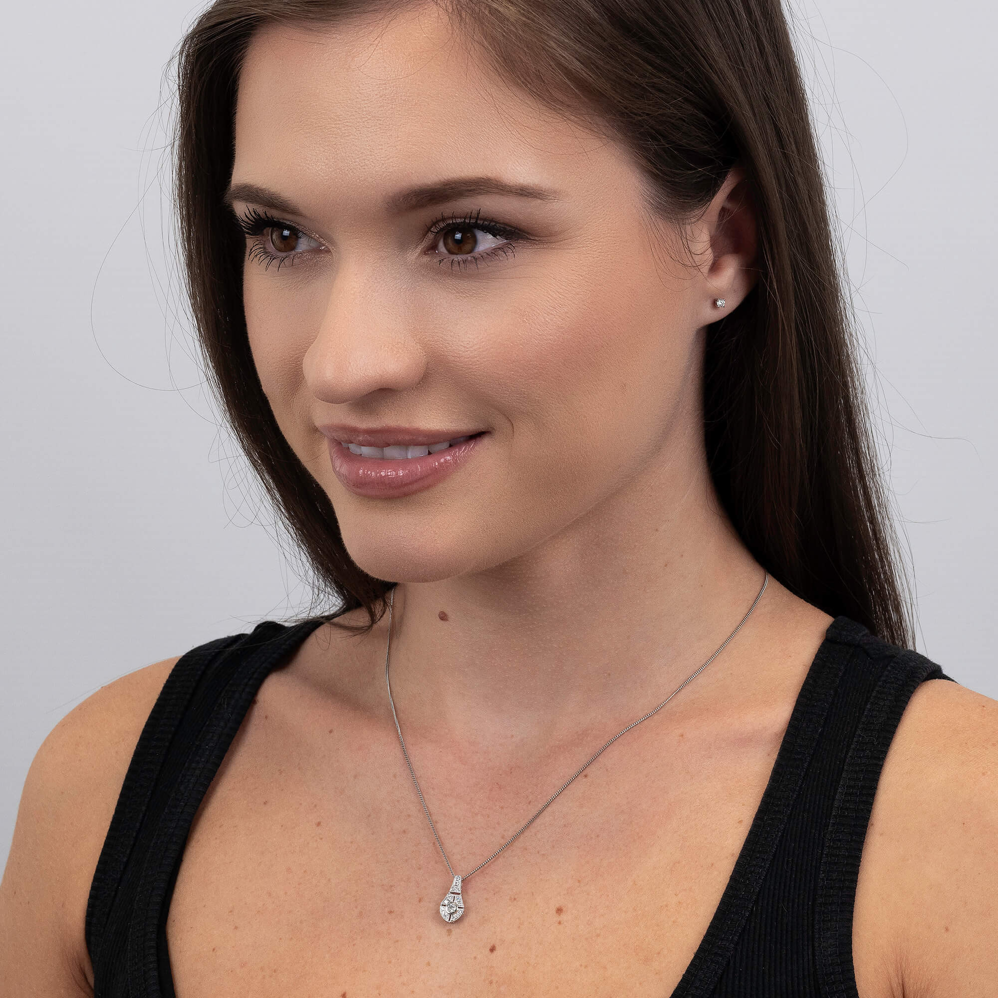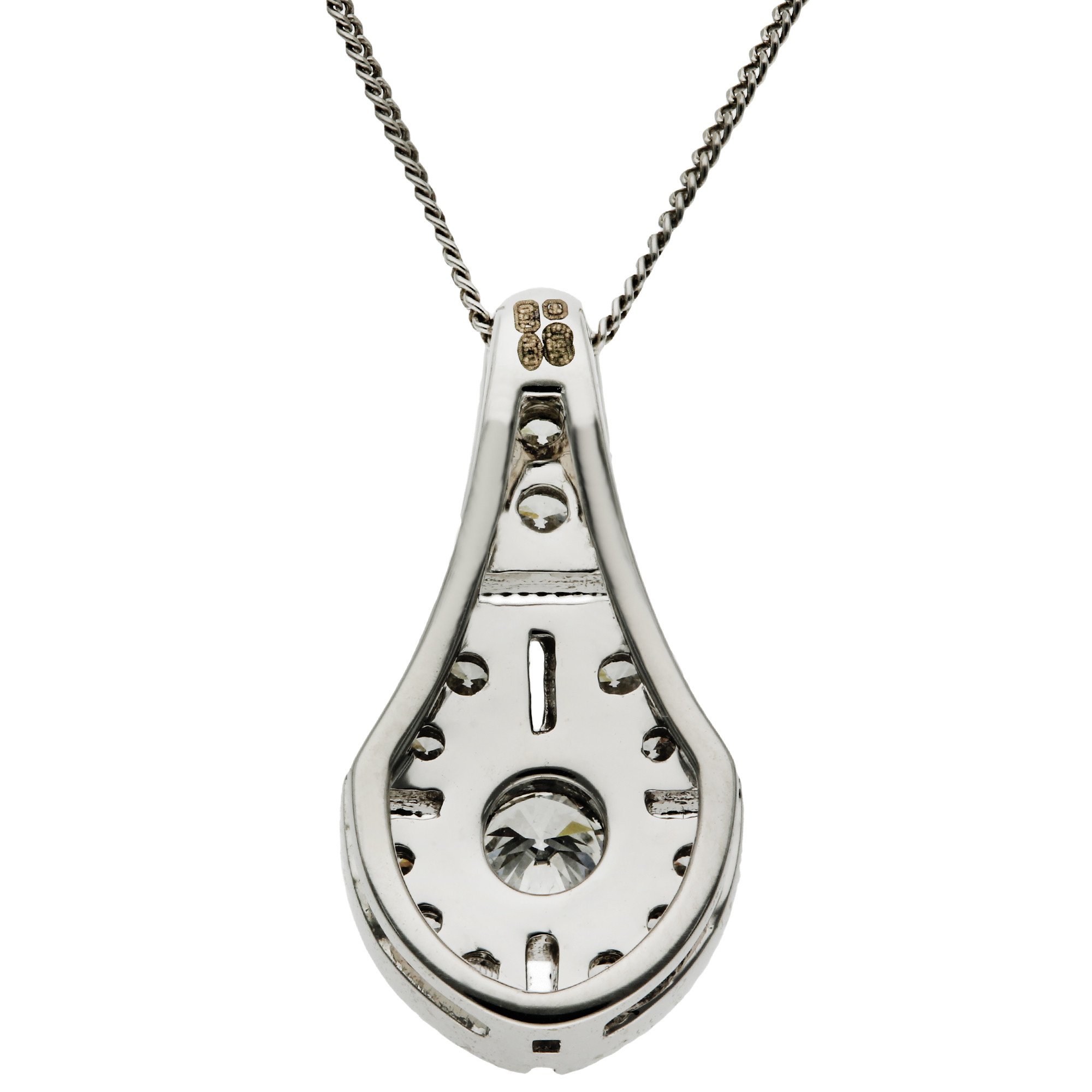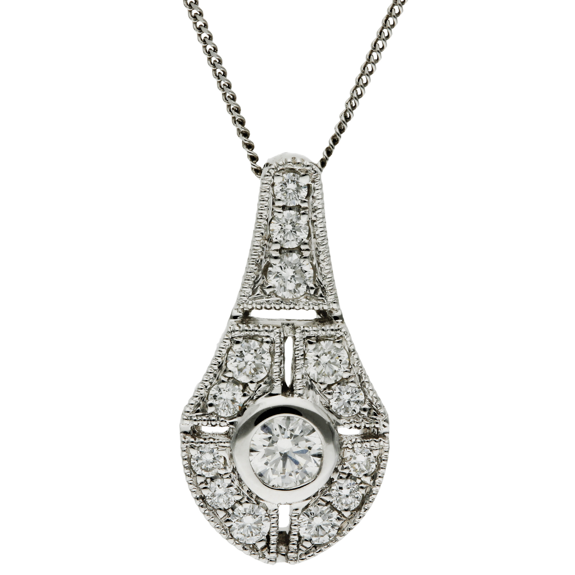 This elegant 18ct white gold pendant showcases a beautifully designed 0.27ct pear shaped diamond cluster, split into sections that frame a bezel set round brilliant cut diamond at the centre. The intricate milgrain edging adds a vintage inspired touch, enhancing the brilliance of the diamonds and creating a refined, timeless look. Crafted in cool white gold, this pendant is accompanied by an 18ct white gold curb chain, ensuring a seamless and sophisticated finish. Perfect for both everyday elegance and special occasions, this diamond pendant exudes luxury and grace, making it a treasured addition to any jewellery collection.