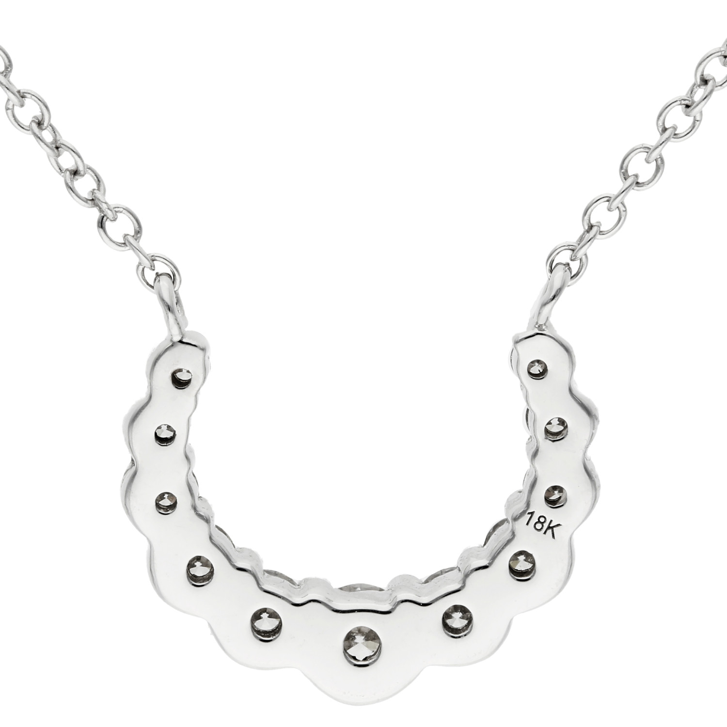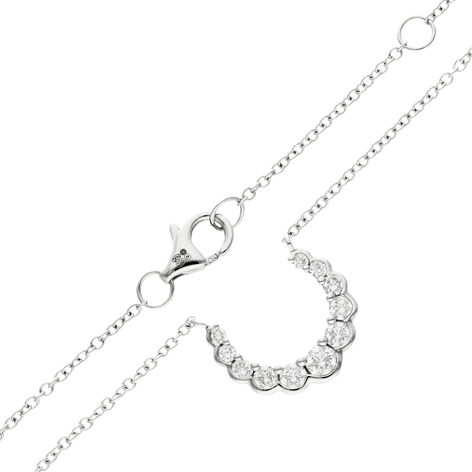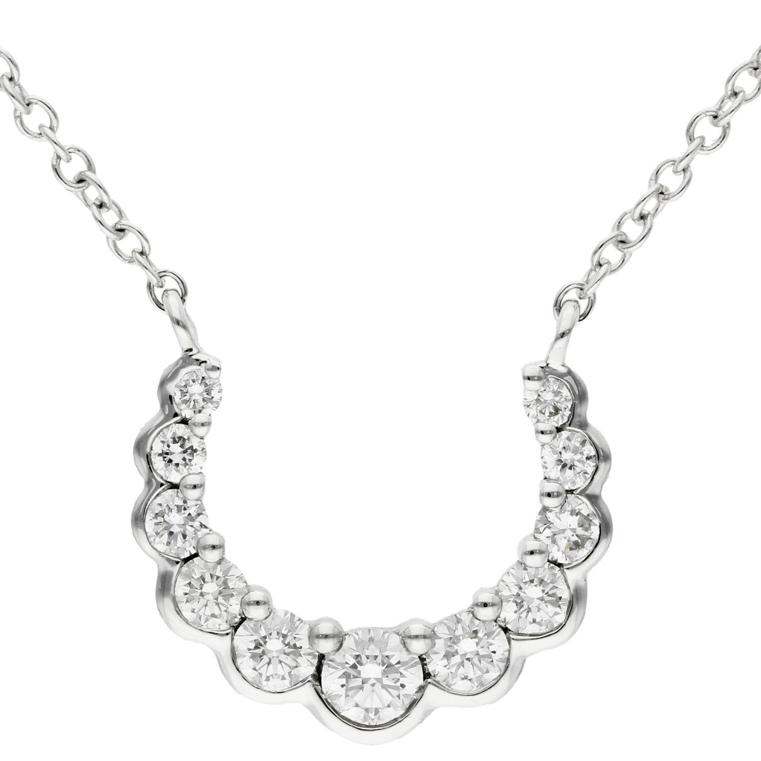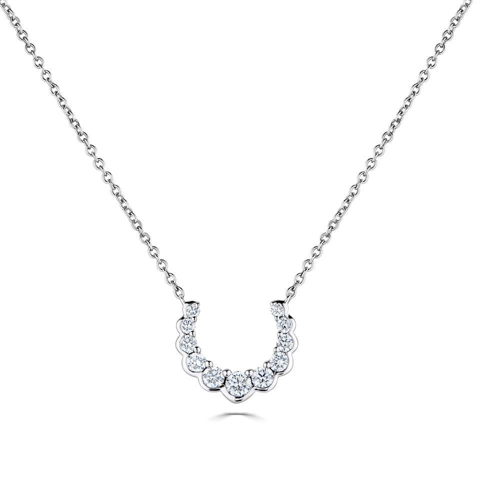 Elevate your style with our stunning 18ct White Gold Diamond Necklace, a symbol of luck and luxury. This exquisite necklace features a crescent shaped pendant, beautifully adorned with graduated round brilliant cut diamonds. Each diamond is meticulously set to showcase its dazzling brilliance, with a polished scalloped bezel setting along the bottom edge and a refined claw set along the top, ensuring every stone captures the light perfectly.