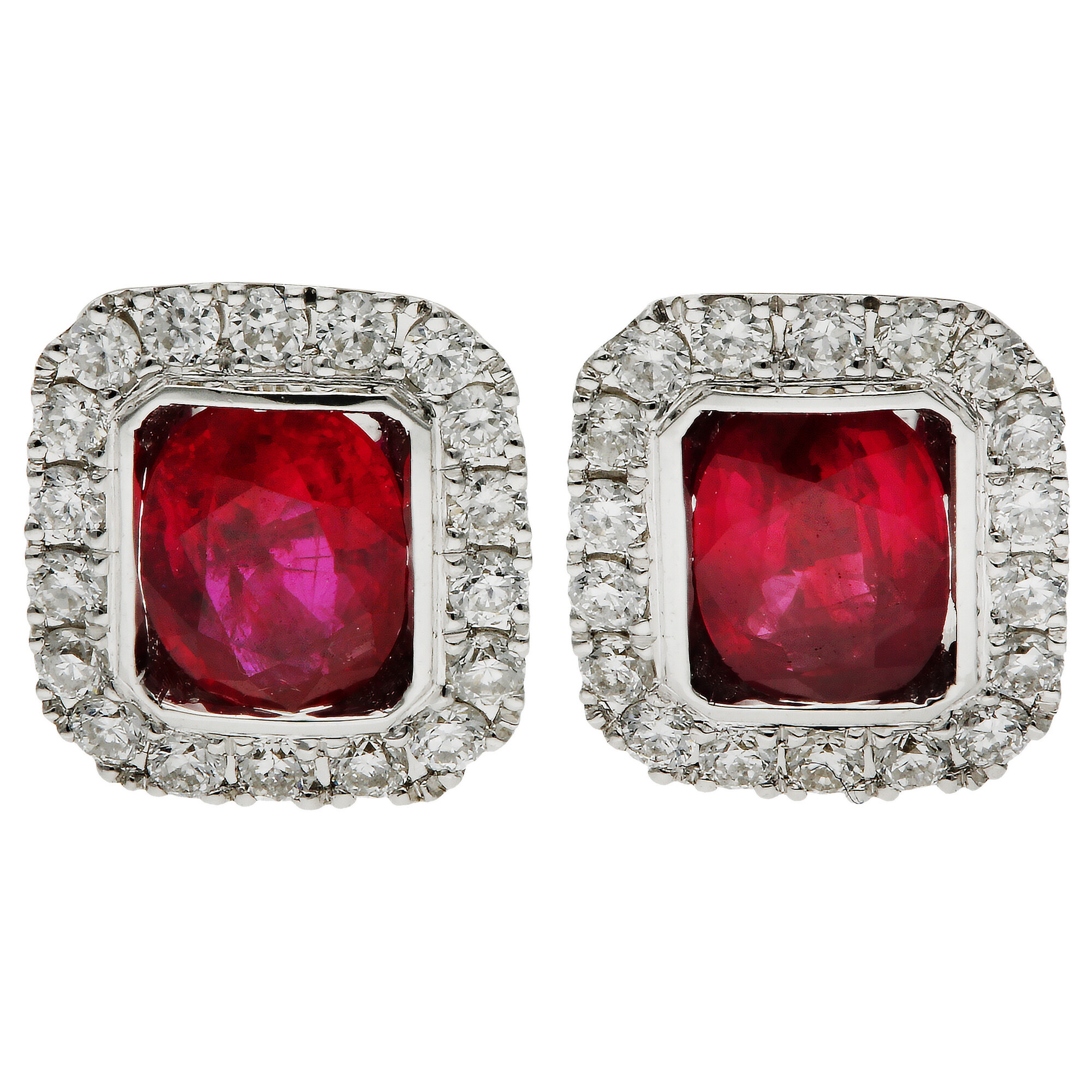 Discover the rich allure of our 18ct White Gold Diamond and Ruby Earrings, a luxurious choice for those who seek elegance and style. Each earring features a captivating oval faceted ruby, set in a sleek rectangle of white gold. The rubies are beautifully framed by a halo of sparkling diamonds, enhancing their deep red colour and creating a striking visual contrast. These earrings are designed as studs, providing a secure and comfortable fit with posts and scroll backs. Ideal for adding a touch of glamour to evening wear or special occasions, these earrings are sure to make a statement and become a cherished part of your jewellery collection.