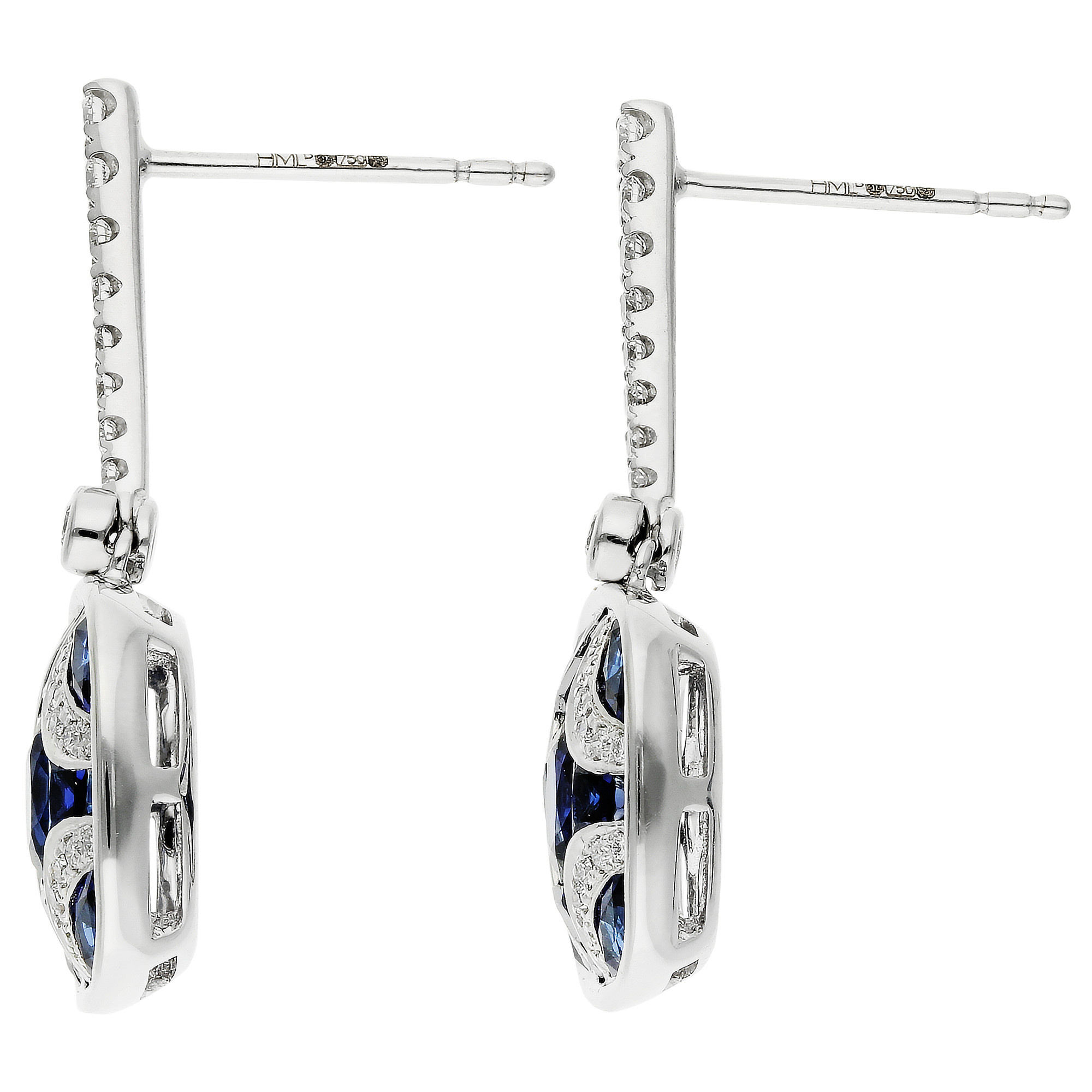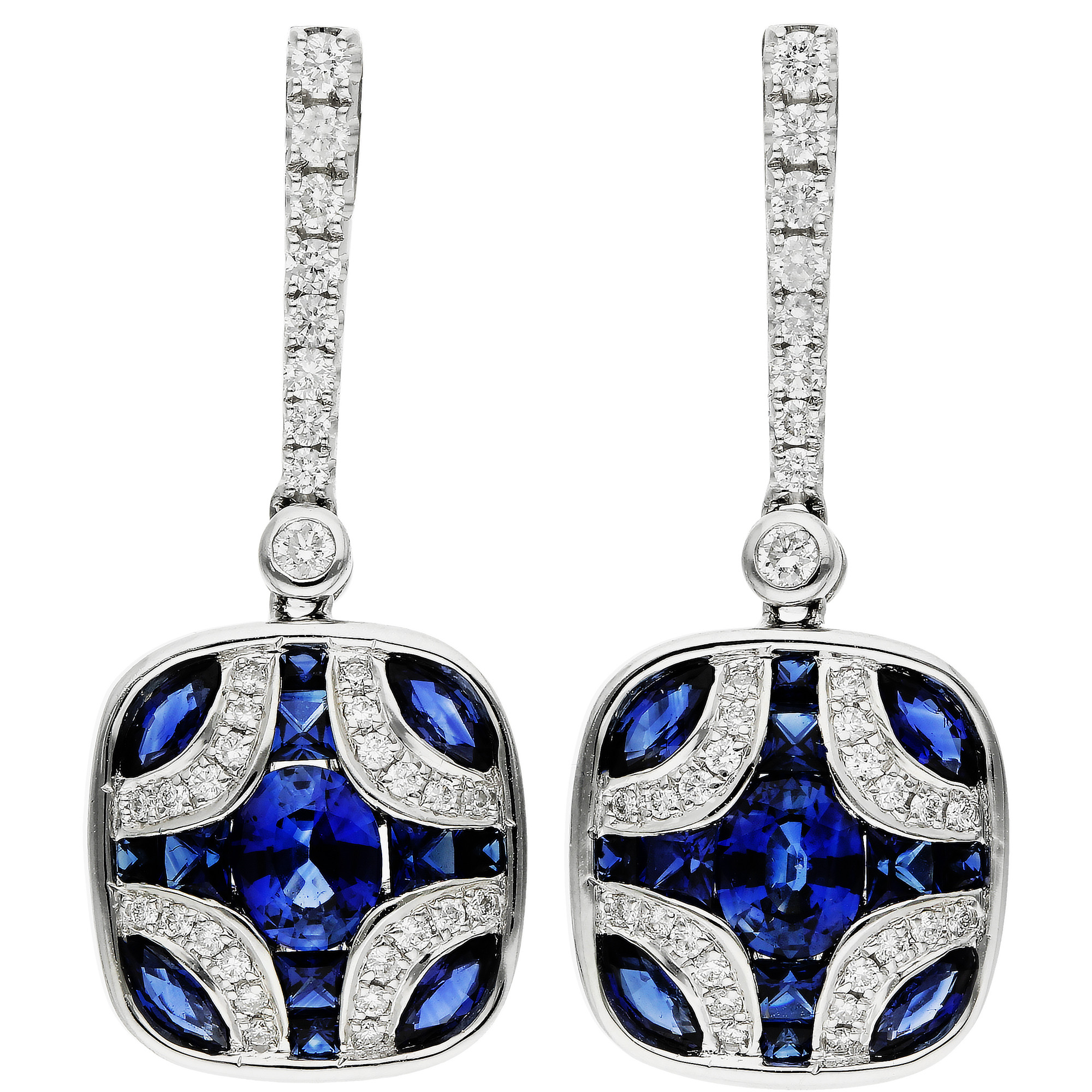 Introducing our exquisite 18ct white gold sapphire and diamond drop earrings, a stunning addition to any fine jewellery collection. Each earring begins with a graduated diamond-set bar, elegantly leading to a striking shield design at the drop. This unique shield features a beautiful array of marquise, oval, and square cut sapphires, each bezel set in lustrous white gold. Accentuating the sapphire arrangement, curves of Pavé set diamonds grace each corner, enhancing the overall sparkle and allure. These earrings are designed with posts and scroll backs, ensuring they remain securely and comfortably in place. Perfect for special occasions or as a luxurious gift, these earrings promise to captivate and add a sophisticated touch to any ensemble.