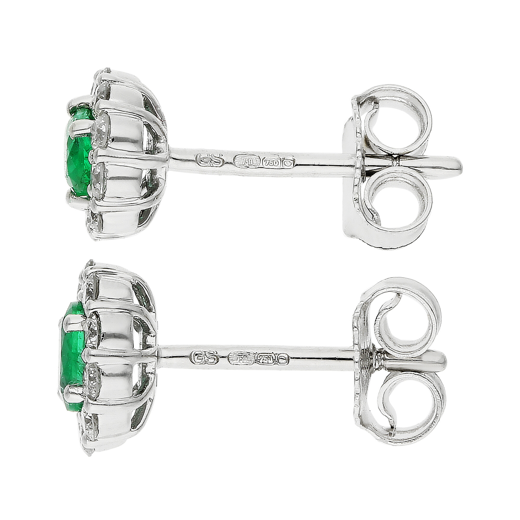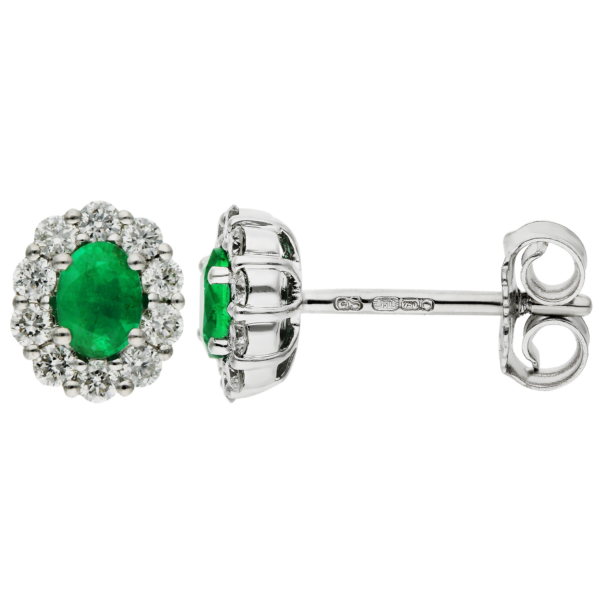 Elevate your jewellery collection with the timeless beauty of these 18ct white gold emerald and diamond earrings. Each earring features a small oval faceted emerald, prized for its rich green hue and captivating brilliance. Surrounded by a glittering halo of fine white diamonds, the emeralds are delicately framed to enhance their vibrant colour and elegant sparkle.