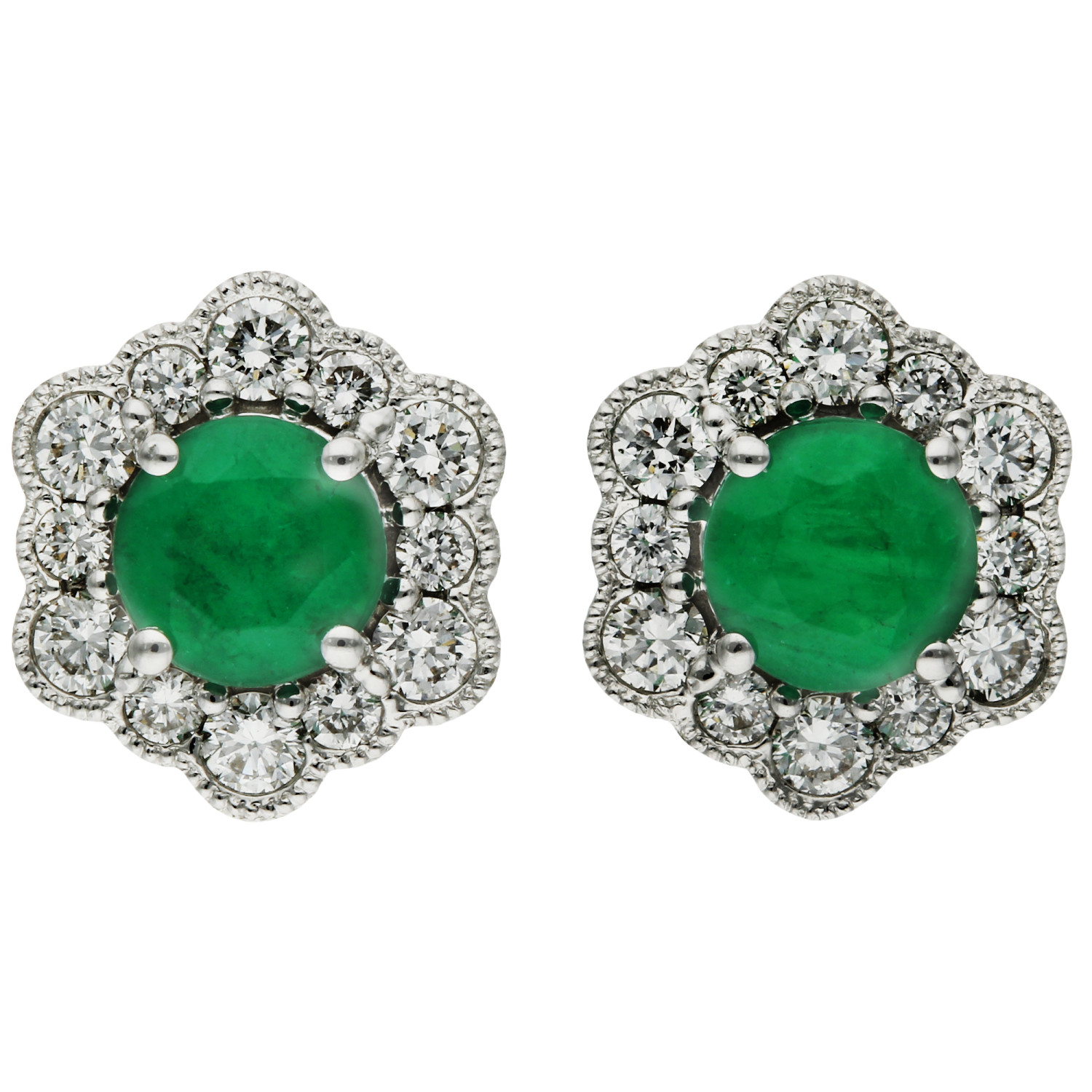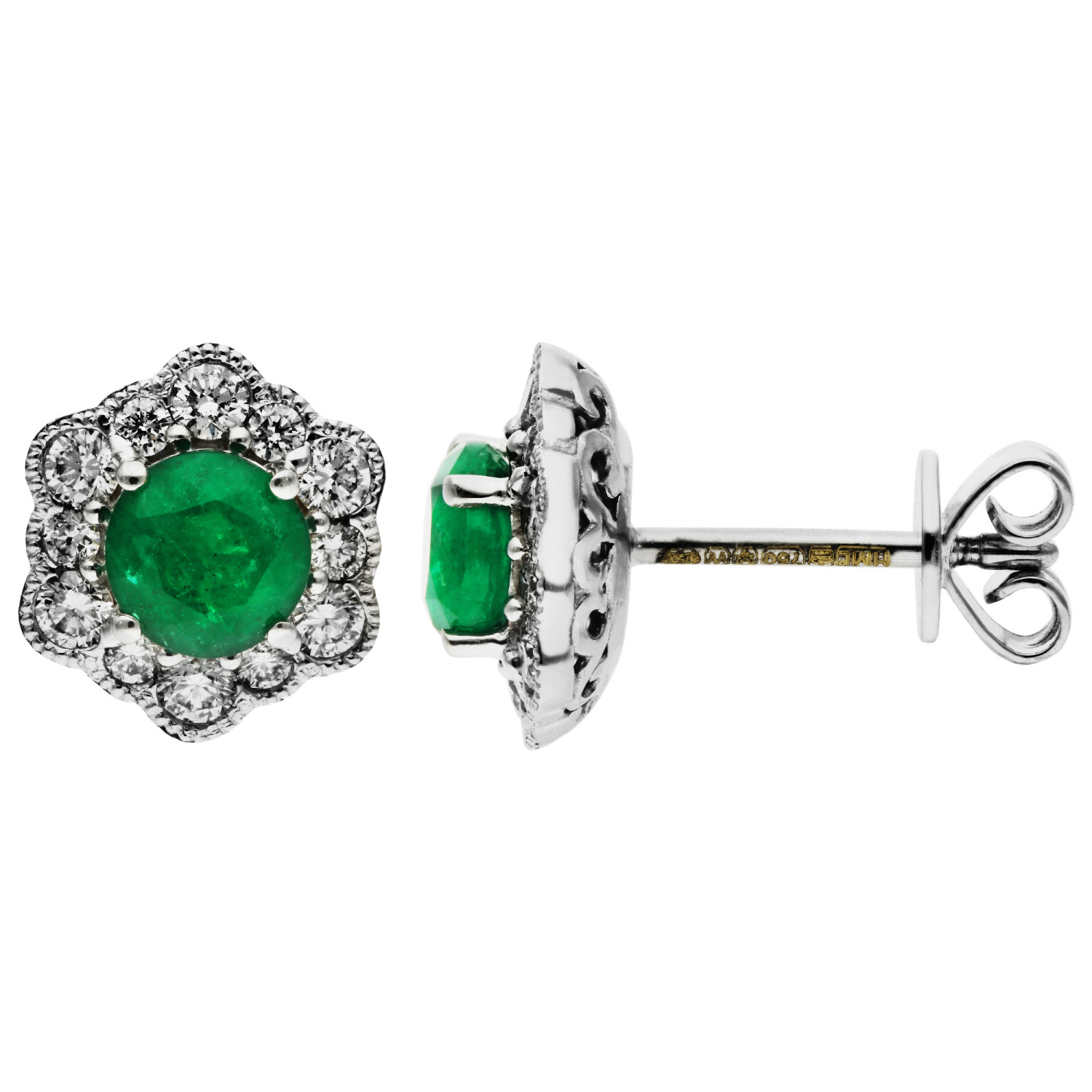 "Introducing our stunning 18ct White Gold Emerald & Diamond Flower Stud Earrings, a dazzling union of nature's splendour and exquisite craftsmanship. Each earring features a radiant round emerald at its core, boasting a lush green hue that symbolizes renewal and growth. This captivating gemstone is encased in a unique hexagonal halo of sparkling diamonds, each carefully set to enhance the emerald's vibrant beauty. The addition of delicate milgrain edging around the diamonds lends a vintage touch, adding an extra layer of sophistication and charm. Crafted in sleek 18-carat white gold, these earrings offer a contemporary yet timeless backdrop, perfectly complementing the rich colour of the emeralds and the brilliance of the diamonds. Ideal for special occasions or as an elegant addition to your everyday style, these Emerald & Diamond Flower Stud Earrings are a testament to classic elegance, designed to captivate and enchant."