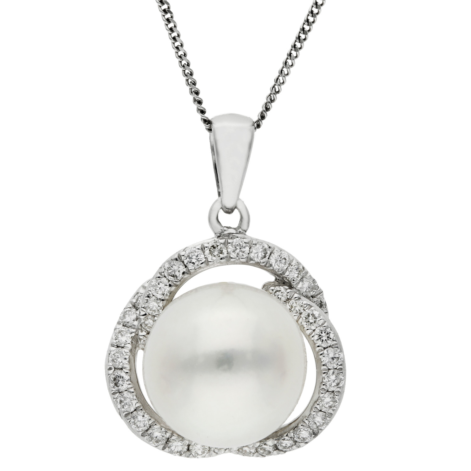 This elegant 18ct white gold pendant features a beautiful round cultured pearl, perfectly set in the centre of three entwined circles adorned with sparkling diamonds. The delicate diamond set circles add a touch of sophistication and glamour, while the lustrous pearl brings timeless elegance to the piece. Suspended from a polished white gold bail, this pendant hangs gracefully from a matching chain, making it the ideal accessory for both special occasions and everyday wear. Whether as a thoughtful gift or a personal treat, this diamond and pearl pendant is a timeless addition to any jewellery collection.