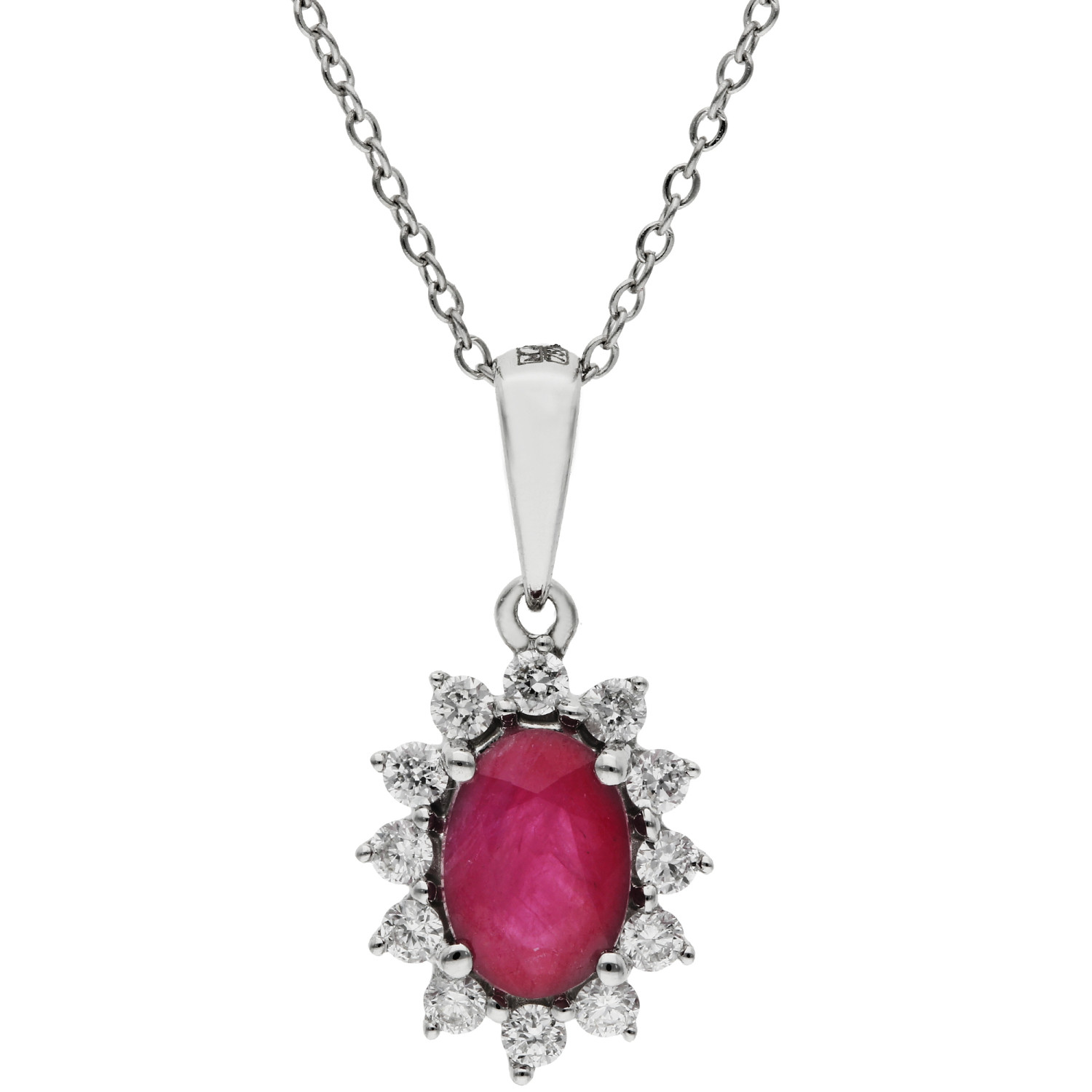 Elevate your style with the captivating allure of our 18ct White Gold Diamond & Ruby Pendant. This exquisite piece features a 0.55ct oval-cut ruby, renowned for its deep crimson hue, symbolizing passion and love. Framed by a dazzling array of meticulously set diamonds, the ruby stands out with magnificent brilliance. Suspended from a polished white gold bail, the pendant hangs gracefully on a luxurious gold chain, offering a sophisticated and classic look that transitions effortlessly from daywear to evening glamour. Perfect for those special occasions or as a stunning gift, this ruby and diamond pendant is a timeless addition to any jewellery collection, promising to enchant and impress.