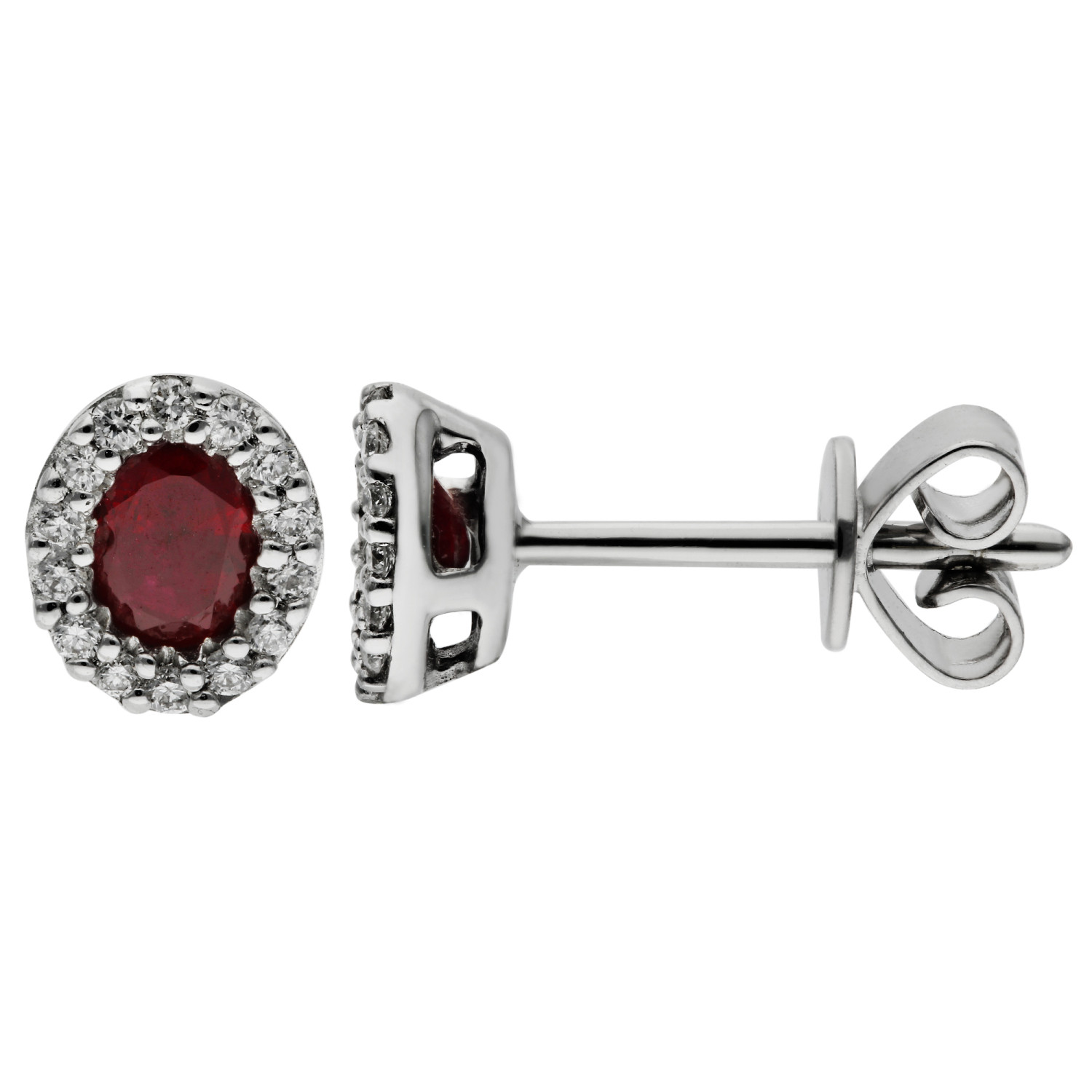 Enhance your jewellery collection with these exquisite 18ct White Gold Diamond and 0.42ct Ruby Earrings. Each stud earring features a vibrant oval faceted ruby, beautifully framed by a halo of sparkling diamonds, creating a timeless and elegant design. The rich red hue of the rubies contrasts beautifully with the brilliance of the diamonds, all set in polished white gold.