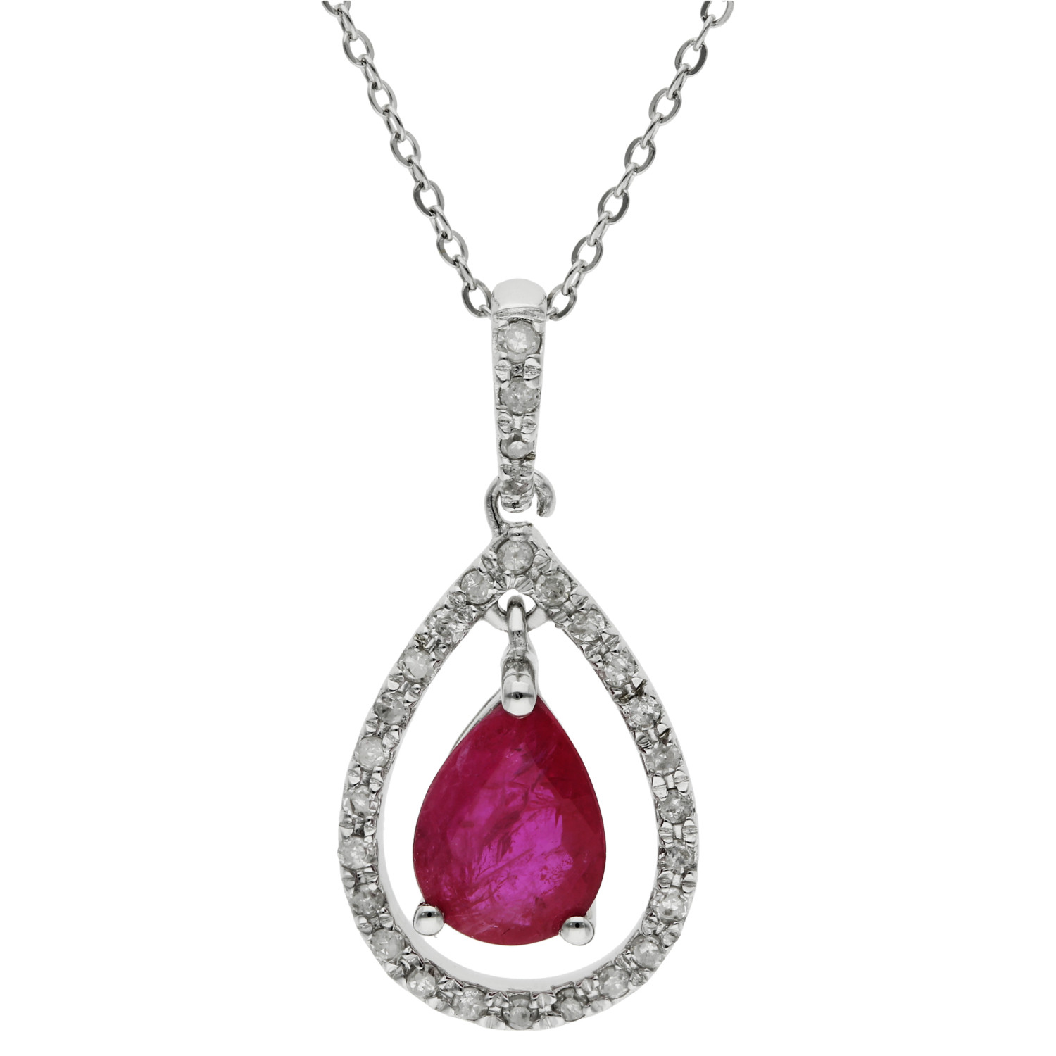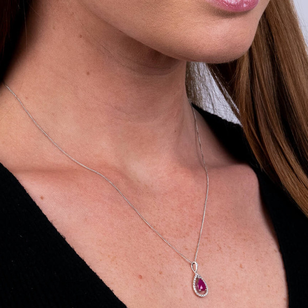 Introducing our stunning 18ct white gold diamond and ruby pendant, a jewel that captures the essence of elegance and luxury. This exquisite pendant features a 0.70ct pear shaped ruby, claw set at the heart of a teardrop shaped diamond halo that enhances the vivid red of the ruby with a sparkling frame. The pendant is gracefully suspended from a diamond set bail, adding an extra layer of brilliance. Accompanied by a sleek white gold chain, this piece is perfect for adding a touch of sophistication to any outfit. Whether you are attending a formal event or looking to elevate your everyday style, this ruby pendant is a timeless choice that promises to enchant.