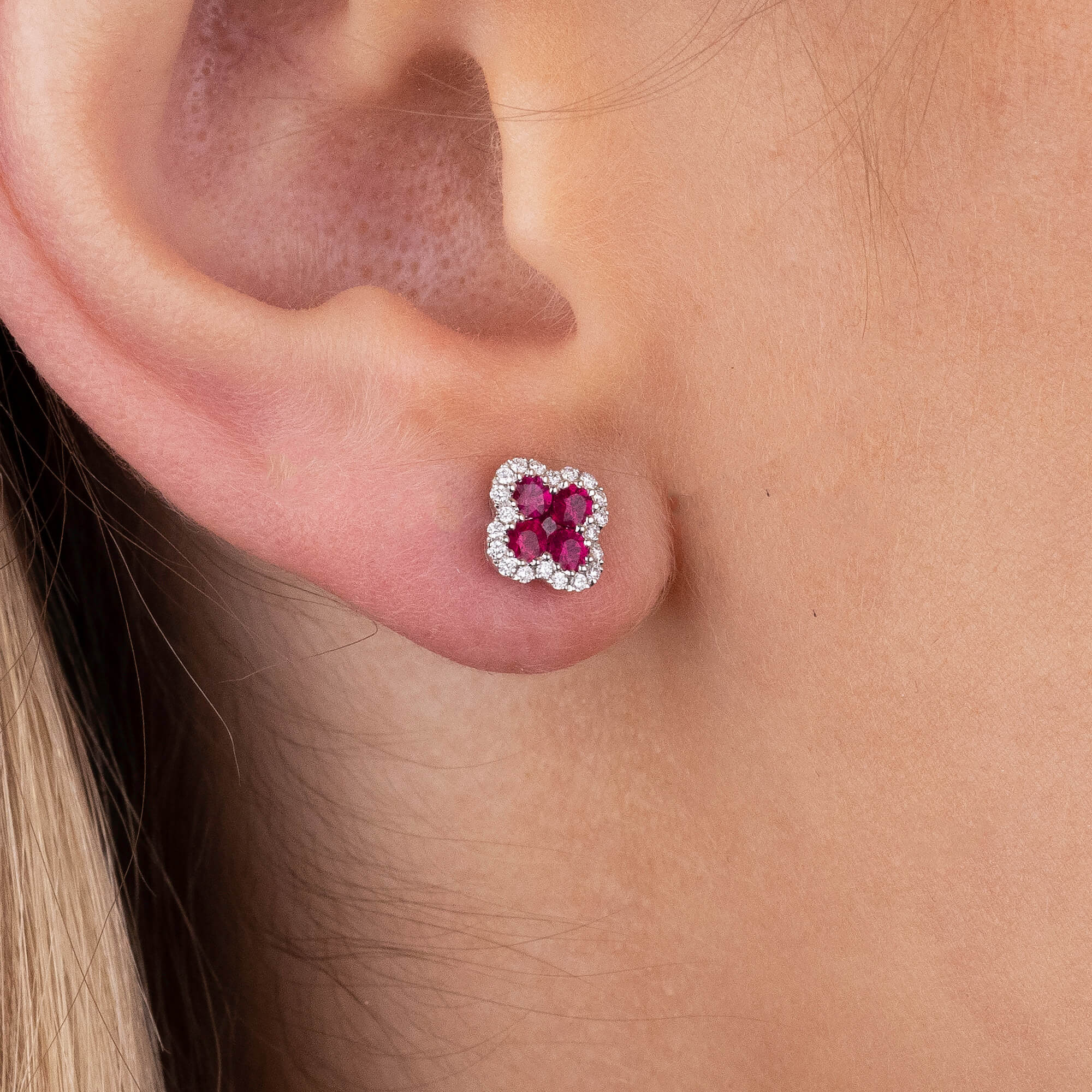 Introducing our exquisite 18ct White Gold Ruby & Diamond Earrings, a masterpiece of design and elegance. Each earring beautifully showcases five vibrant rubies, meticulously arranged in a quatrefoil or four-leaf clover pattern, totalling 0.44ct across both pieces. This symbolic design not only represents luck but also brings a unique aesthetic appeal, with each ruby perfectly framed by a halo of sparkling diamonds.