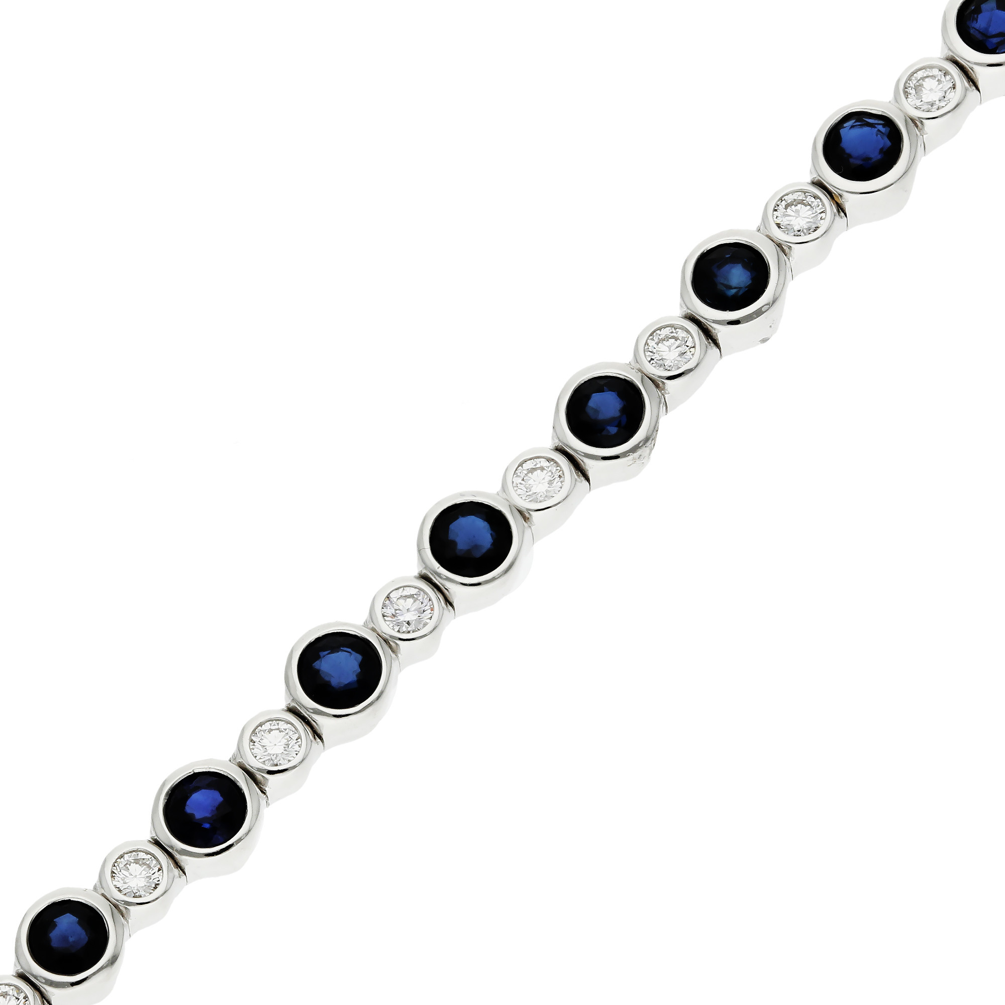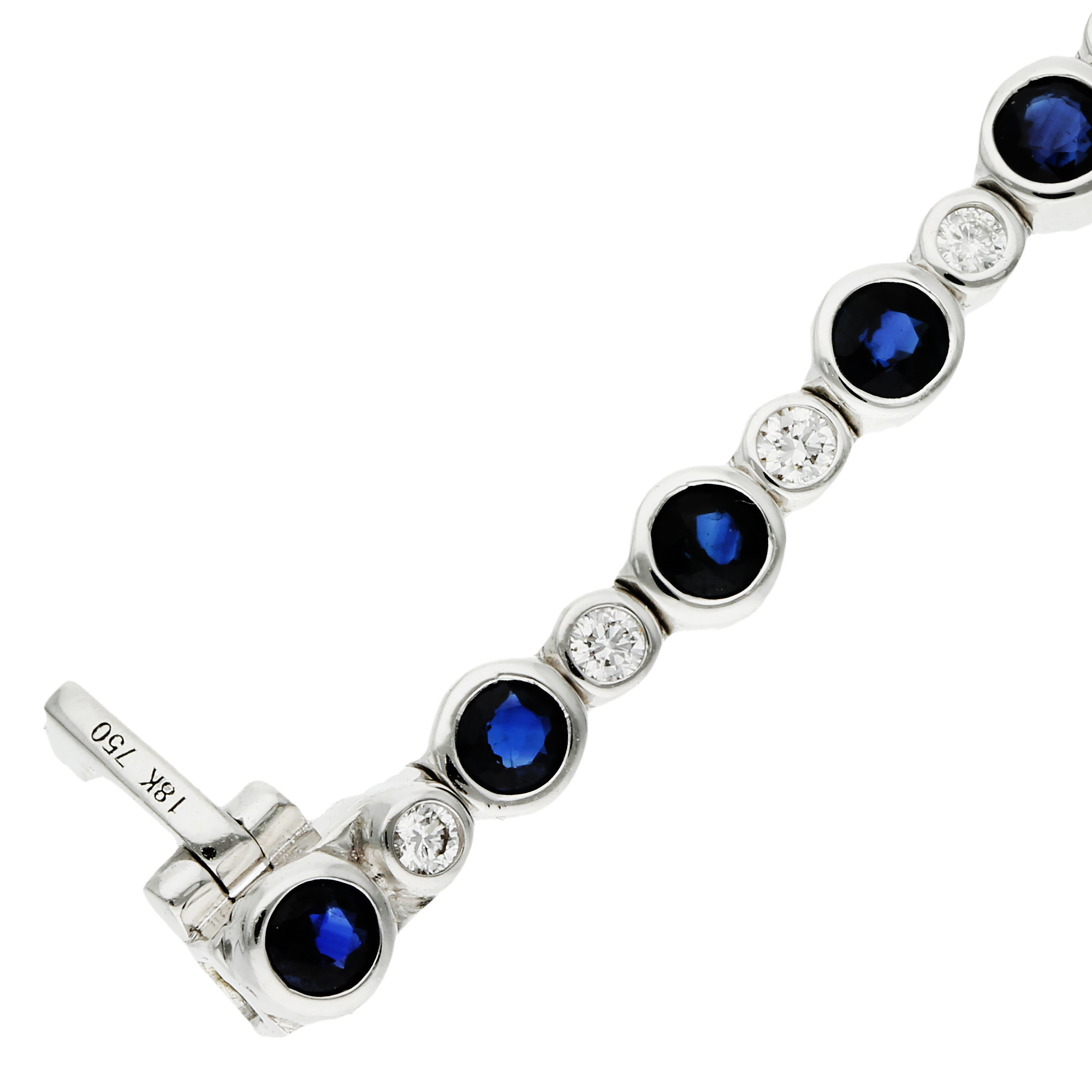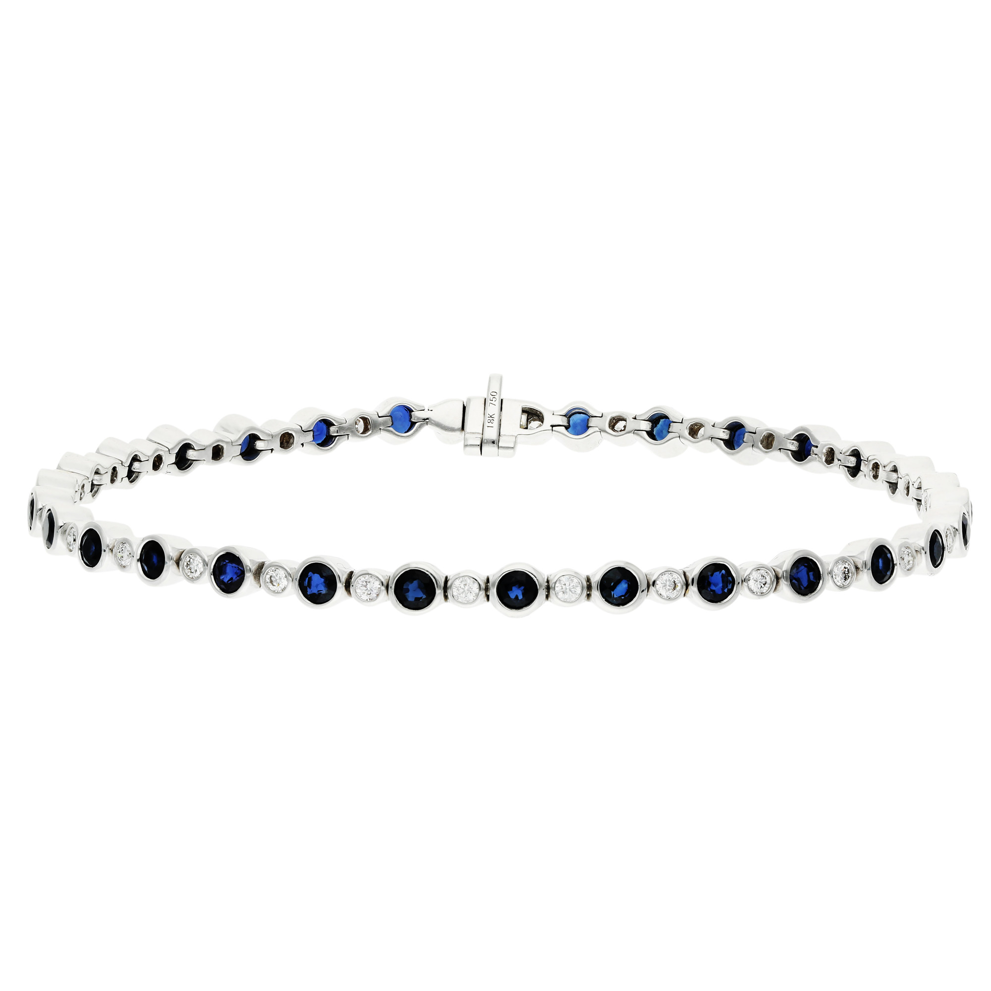 Elevate your elegance with our 18ct white gold tennis bracelet, featuring a stunning composition of 3.50 carats of round sapphires, each securely held in a bezel setting. Between each sapphire, a small bezel-set diamond twinkles, adding a subtle yet impactful sparkle. This bracelet marries classic charm with contemporary design, making it a versatile piece for all occasions. Its secure fastening ensures it sits comfortably on the wrist, making it perfect for everyday wear or special events.