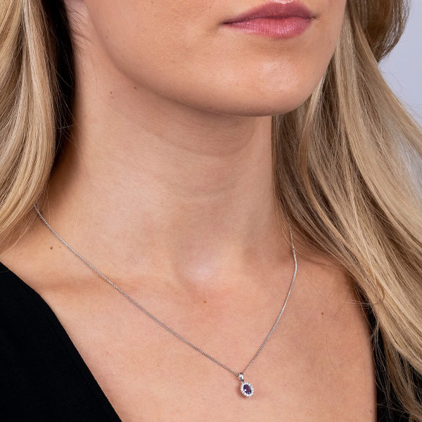 Explore the enchanting allure of our 18ct white gold diamond and tanzanite pendant. This stunning piece features a 0.40ct oval faceted tanzanite, renowned for its vibrant bluish-violet hue, beautifully framed by a halo of sparkling diamonds. The pendant dangles gracefully from a polished white gold bail, adding a sophisticated touch to its overall design. Accompanied by a complementary white gold chain, this pendant is perfect for any occasion, effortlessly elevating evening wear or adding a touch of luxury to everyday outfits. Ideal for gifting or as a special addition to your jewellery collection, this tanzanite and diamond pendant is a testament to timeless elegance and contemporary style.