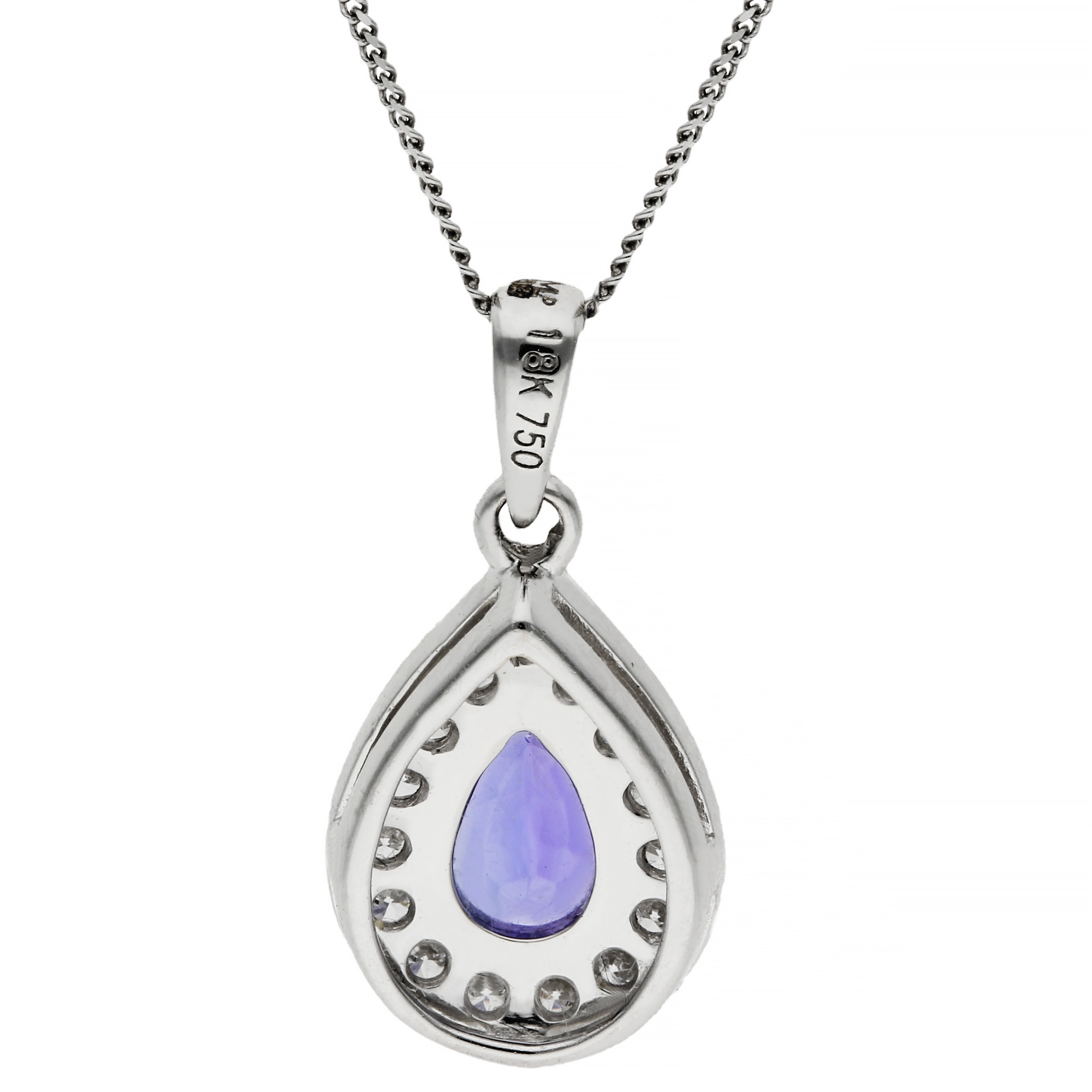 This stunning 18ct white gold pendant features a captivating 0.38ct pear shaped tanzanite, beautifully framed by a halo of sparkling diamonds. The intricate milgrain detailing along the edge adds a vintage inspired charm, enhancing the elegance of the piece. The rich blue hues of the tanzanite are perfectly complemented by the brilliance of the diamonds, creating a striking contrast. Suspended from a polished white gold bail, this pendant hangs gracefully from the matching chain, offering a refined and timeless look. Ideal for both special occasions and everyday wear, this tanzanite and diamond pendant will add a touch of sophistication to any outfit.