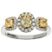 Experience unparalleled luxury with this exquisite 18ct White Gold 1.30ct Diamond Ring, designed to captivate and inspire. This spectacular triple diamond halo ring features two cushion cut light yellow diamonds alongside a central oval cut light yellow diamond, creating a harmonious blend of elegance and vibrance. The diamonds are held in 18ct yellow gold claw settings, adding a warm touch to the design, while each stone is framed by a halo of sparkling white diamonds that amplify their brilliance.