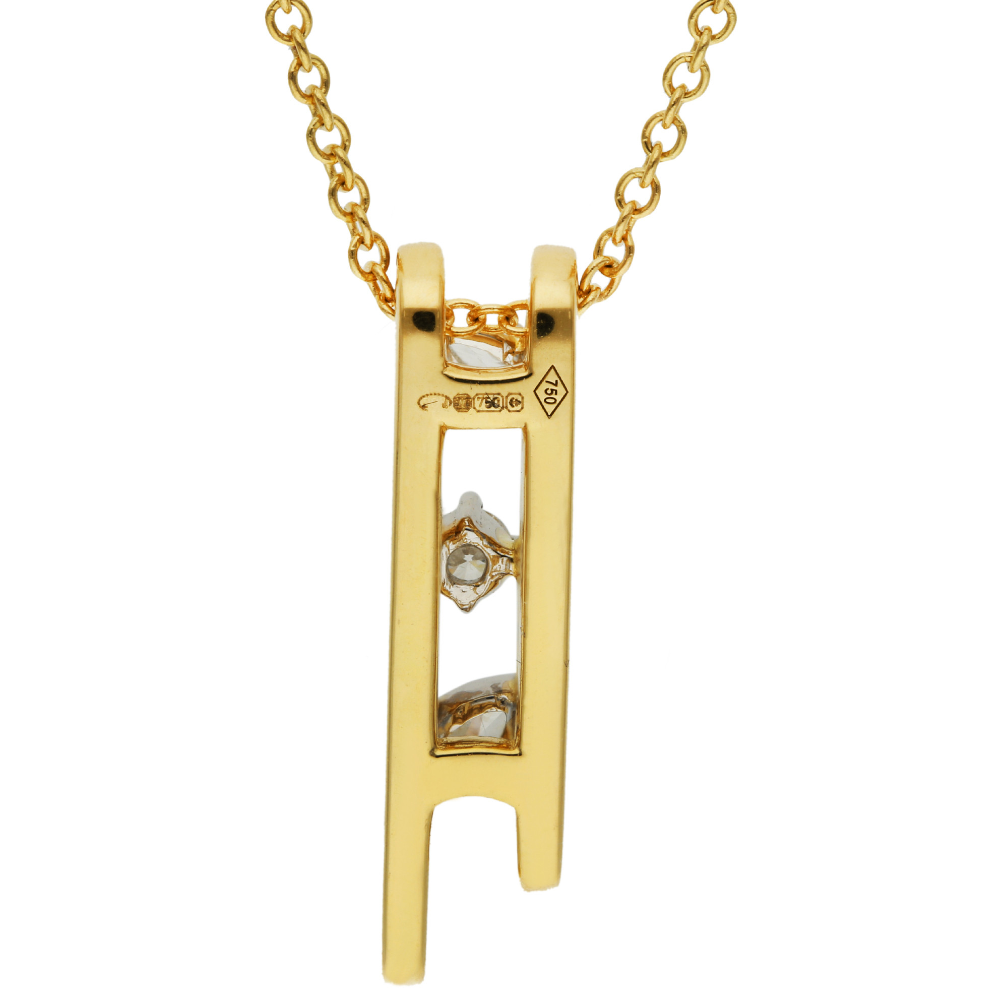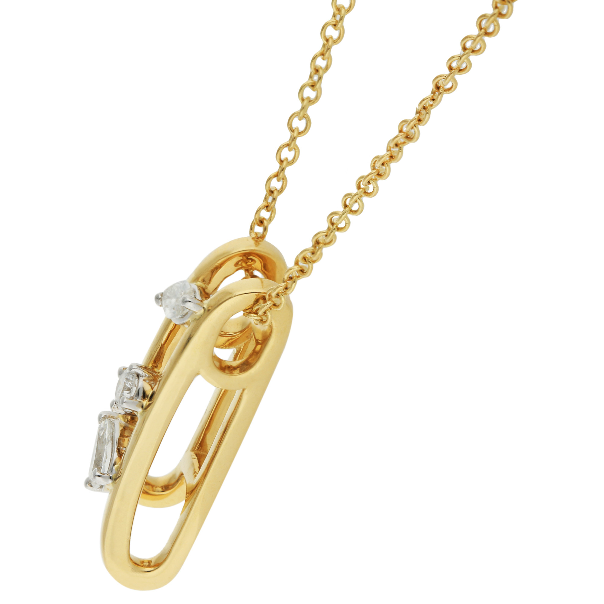 Introducing our exquisite 18ct yellow gold double loop drop pendant, a sophisticated addition to any fine jewellery collection. This pendant features a unique design with two connected loops, elegantly set with a marquise, a princess, and a pear cut diamond, totalling 0.25 carats. Each diamond is meticulously placed to enhance the pendant's visual flow and sparkle. The pendant is presented on an adjustable 18 to 16inch chain, allowing for versatile styling to complement various necklines. Ideal for adding a touch of luxury to everyday wear or as a standout accessory for special occasions, this pendant is a timeless piece that exudes elegance and refinement.