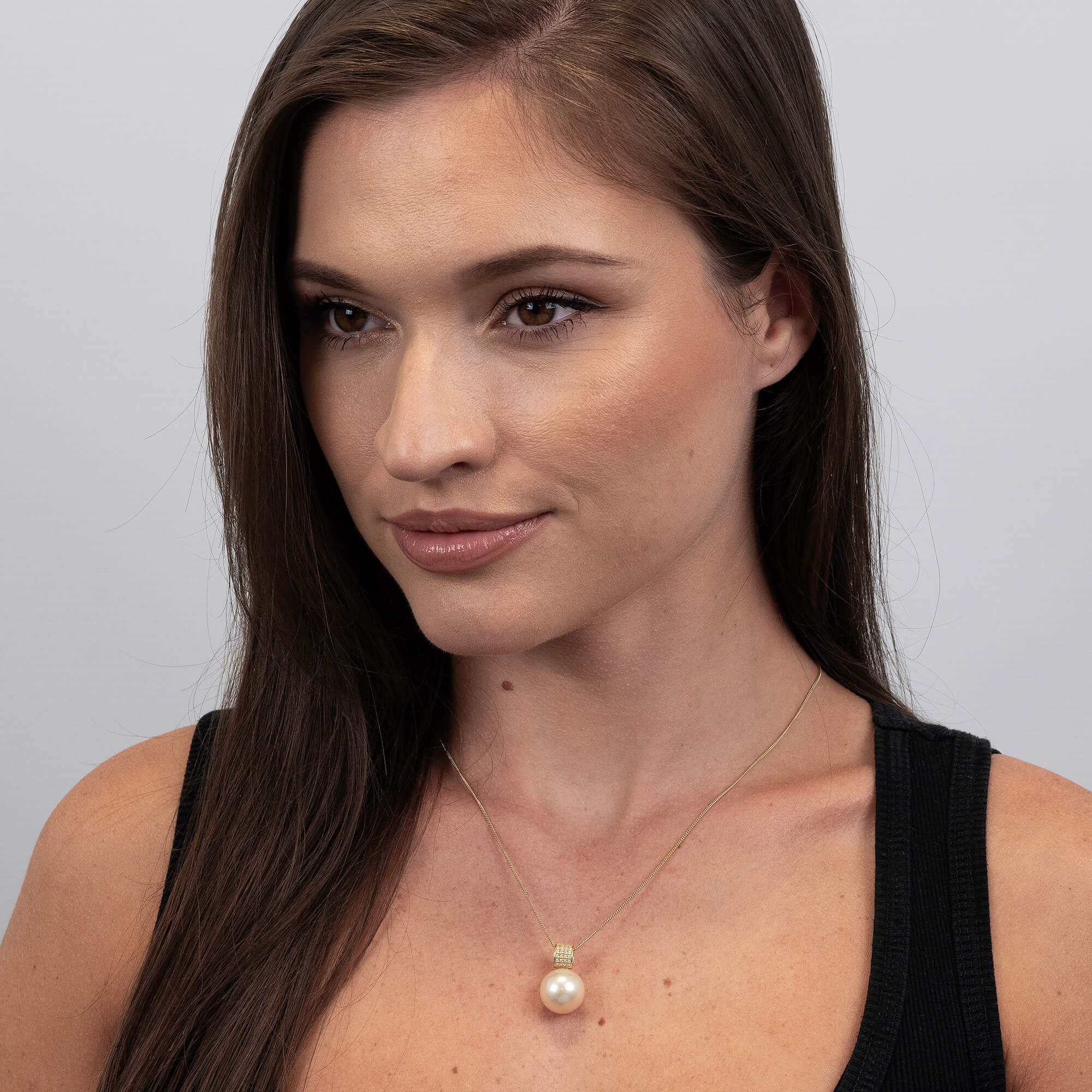 This exquisite 18ct yellow gold pendant showcases a plump cultured river pearl, beautifully set on a diamond encrusted tube bail. The rich gold contrasts elegantly with the lustrous pearl, while the shimmering diamonds add a touch of sparkle and luxury. Suspended from a matching yellow gold chain, this pendant is perfect for adding a touch of sophistication to any outfit. Whether worn for a special occasion or as a daily statement of elegance, this diamond and pearl pendant makes a timeless addition to any jewellery collection. A thoughtful gift or personal treat, it is sure to be cherished for years to come.