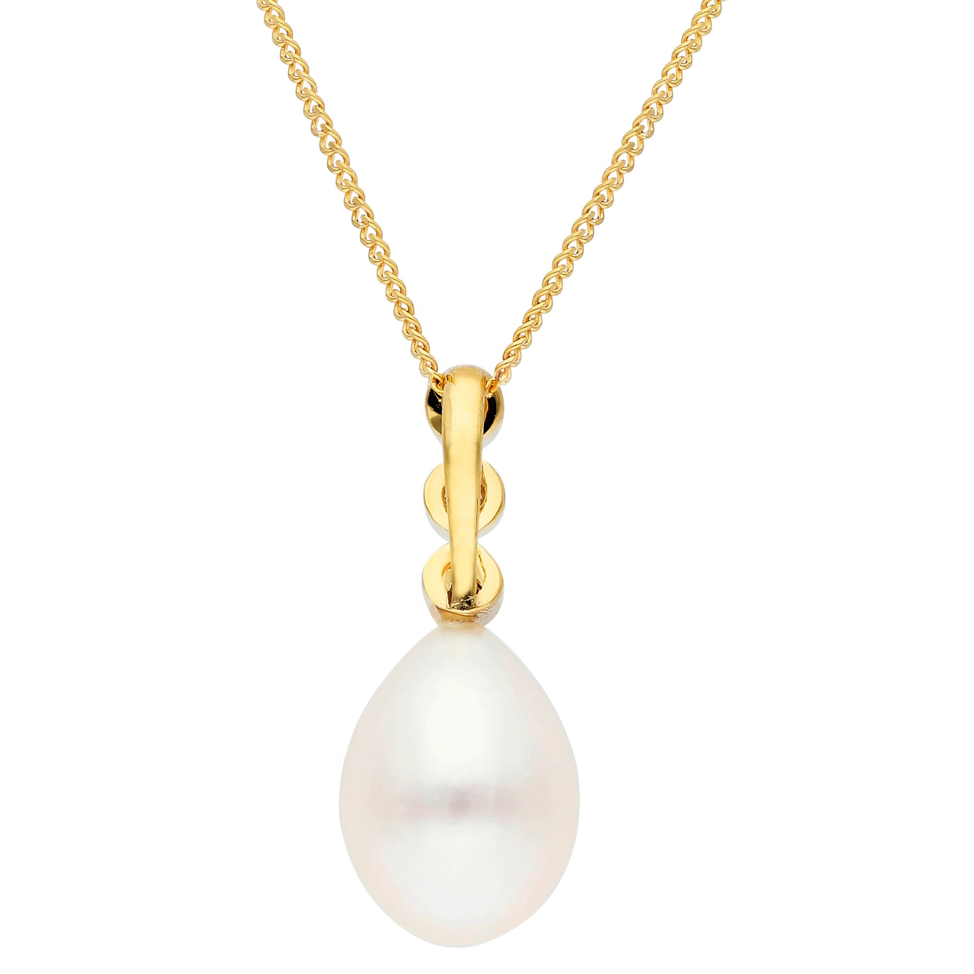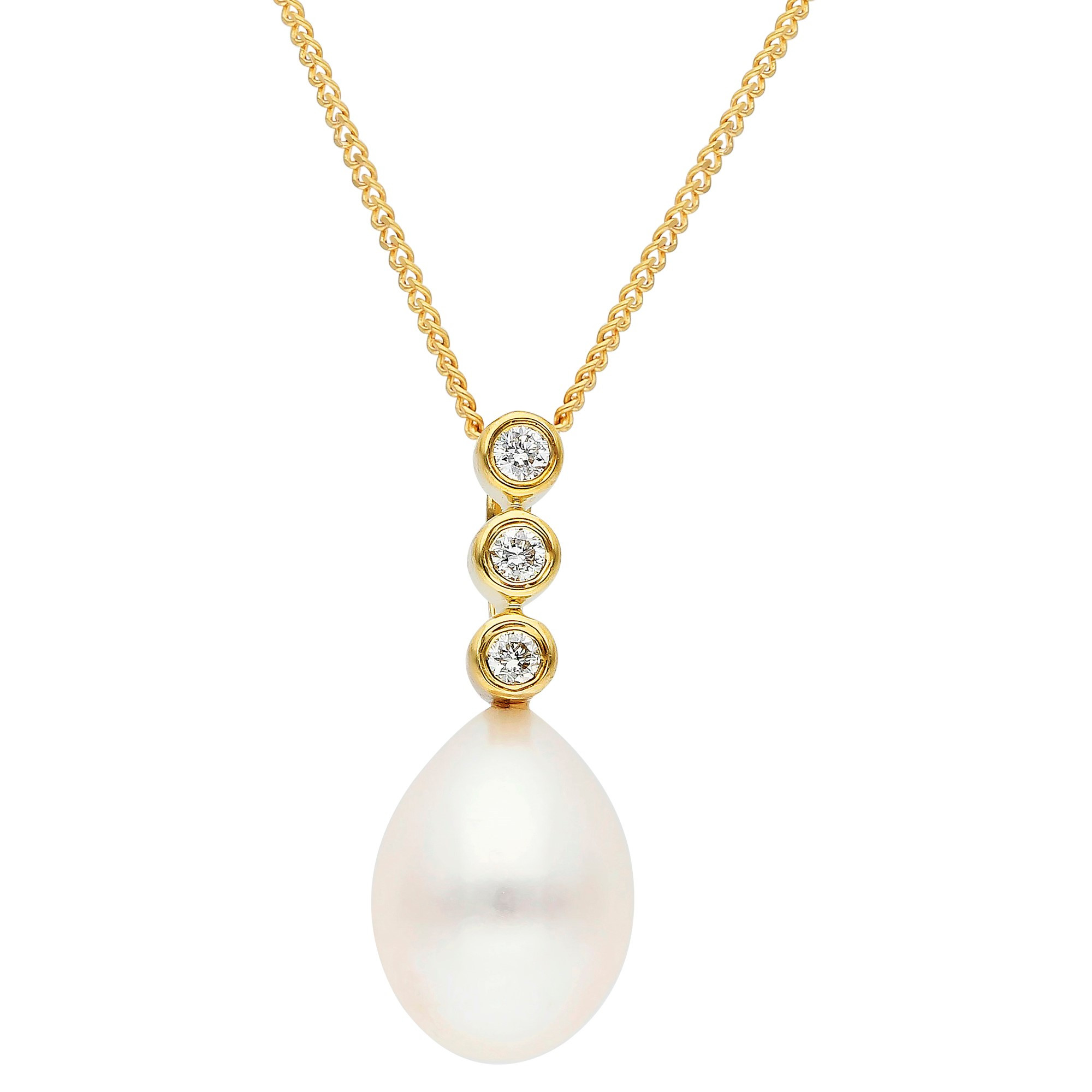 Elevate your jewellery collection with this exquisite 18ct yellow gold pendant, featuring a lusciously plump oval cultured river pearl. Suspended elegantly from a surmount adorned with three sparkling bezel set diamonds, this pendant exudes sophistication. Each pearl is carefully selected for its lustrous sheen, ensuring that it stands out as a symbol of elegance and purity. The delicate pendant chain, crafted from the finest yellow gold, complements the pendant perfectly, making it a versatile piece for both daywear and evening attire. Ideal for those who appreciate the timeless beauty of pearls accented with the brilliance of diamonds.