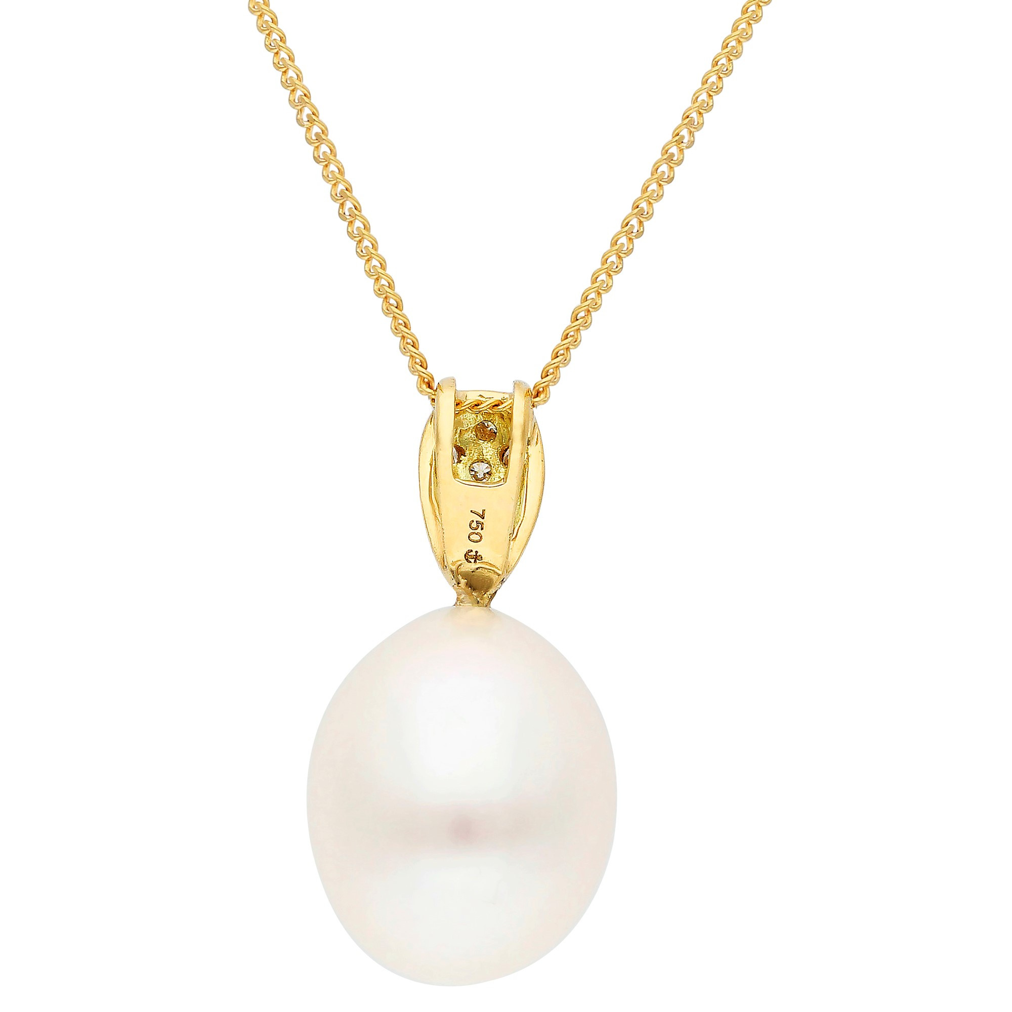This elegant 18ct yellow gold pendant features a beautiful oval cultured river pearl, known for its natural lustre and smooth surface. The pearl is suspended from a diamond set yellow gold surmount, adding a touch of sparkle and luxury to the design. The warm tones of the yellow gold perfectly complement the richness of the pearl and diamonds, creating a timeless piece that exudes sophistication. Complete with a matching gold chain, this pendant is ideal for both everyday wear and special occasions. A perfect gift or a treasured addition to any jewellery collection.