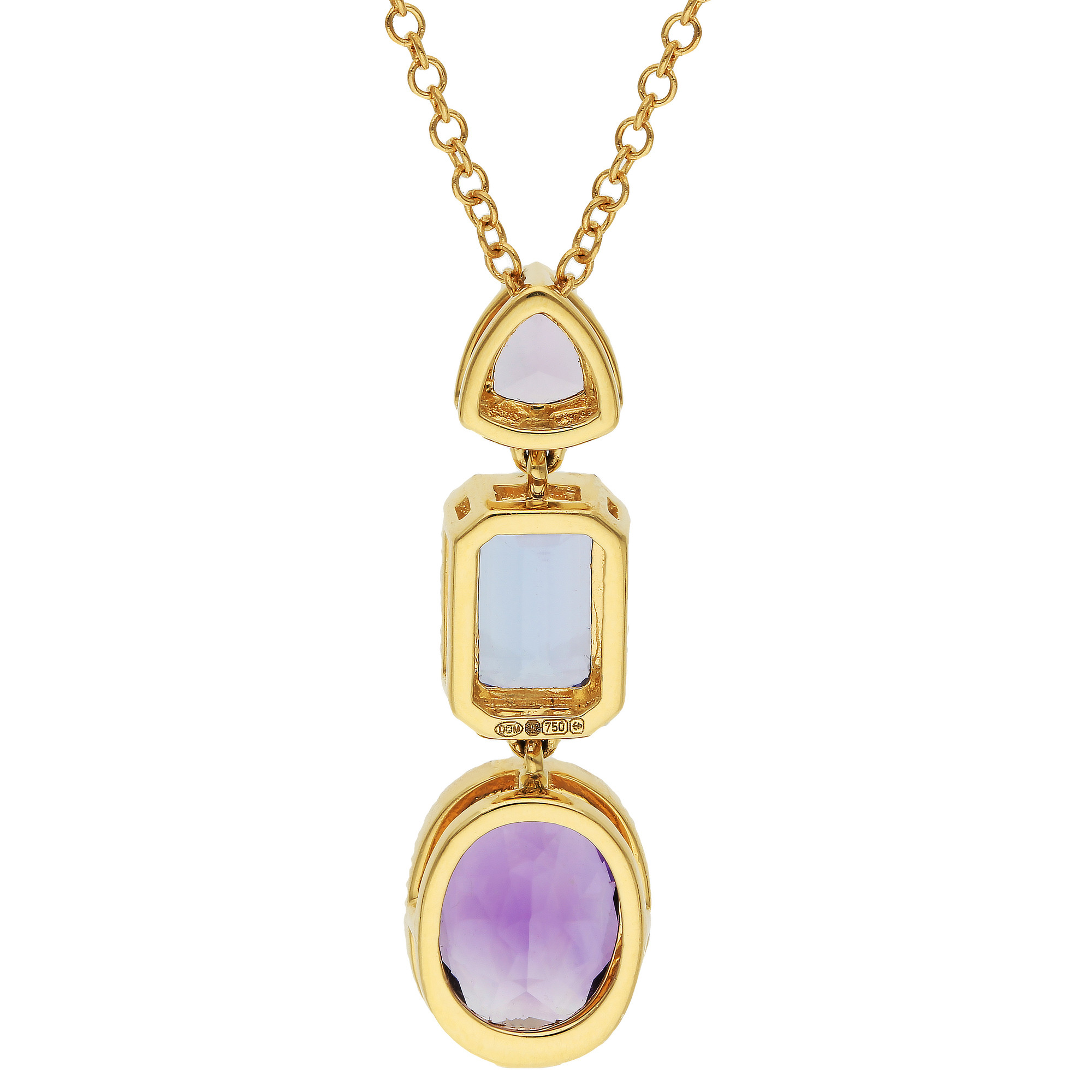 Introducing our stunning 18ct yellow gold pendant, elegantly featuring a trio of beautifully cut gemstones. This exquisite piece starts with a trilliant cut rose amethyst, known for its captivating pink hue, linked to a vivid emerald cut tanzanite, celebrated for its deep blue-violet colour. Completing this harmonious sequence is an oval cut amethyst, bezel set to showcase its deep purple brilliance. Each gemstone is thoughtfully arranged to create a striking visual flow, complemented by the warm tones of the yellow gold setting. The pendant comes complete with an 18 inch chain, making it an ideal choice for those seeking a piece that combines sophistication with a splash of colour.