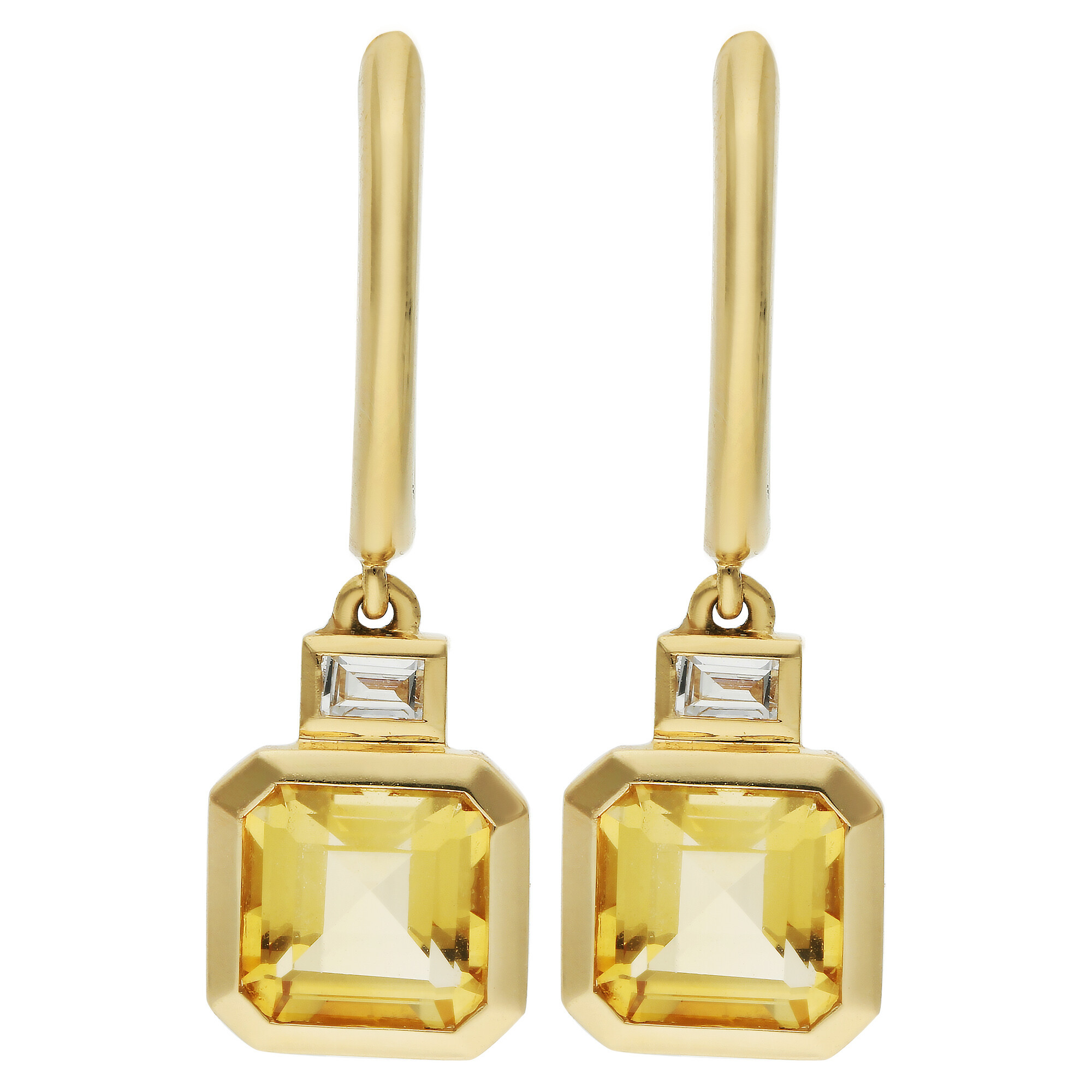 Brighten your jewellery collection with the golden glow of these 18ct yellow gold citrine and diamond earrings. Each earring features a square emerald cut citrine, bezel set to showcase its rich colour and striking clarity. The bold golden tones are perfectly complemented by a sleek baguette cut diamond held just above, also bezel set for a smooth, contemporary finish.