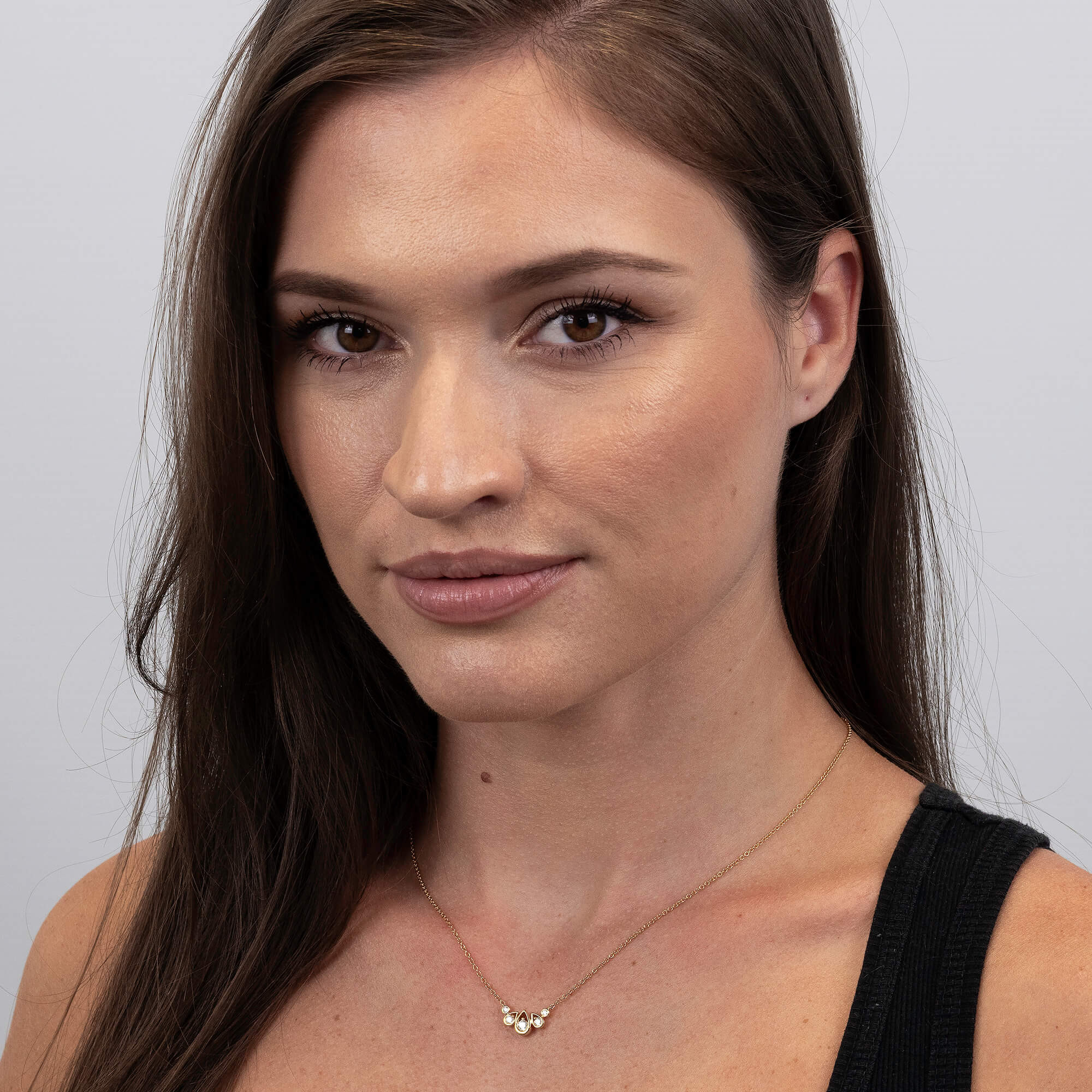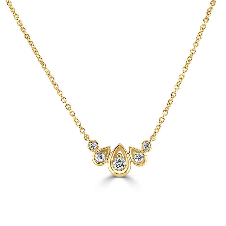 Add timeless elegance to your jewellery collection with this exquisite 18ct yellow gold diamond necklace. The design features a crescent shaped pendant crafted from three teardrop shaped settings, complemented by a round setting on each end. Each setting encloses a sparkling round brilliant diamond, totalling 0.27ct, creating a harmonious and radiant display.