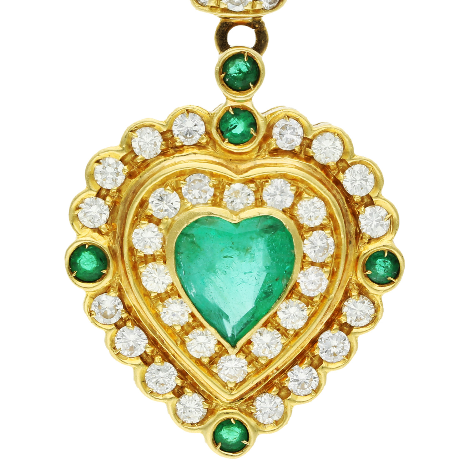 Unveil the romance and elegance with our Pre-owned 18ct Yellow Gold Diamond & Emerald Heart Pendant. This stunning pendant features a heart-shaped central emerald, exquisitely framed by sparkling diamonds that illuminate its rich green tones. Each quarter of the heart is adorned with round, faceted emeralds set in 18ct yellow gold, enhancing the intricate design with scalloped edging that adds a touch of vintage charm.