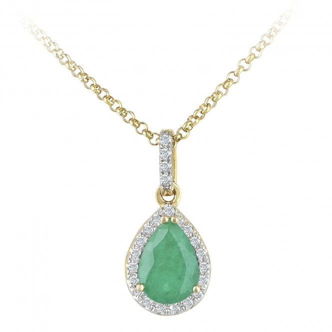 Discover the timeless elegance of our 18ct Yellow Gold Emerald and Diamond Pendant. This exquisite piece features a 0.50ct pear shaped emerald, claw-set in luxurious yellow gold, exuding a vibrant, captivating green. Encircling the emerald is a halo of meticulously set diamonds that enhance the gemstone's rich hue with their sparkling brilliance. Adding further allure, the pendant is suspended from a diamond set bail, providing a seamless sparkle that draws the eye upward. This pendant comes complete with a chain, making it ready to wear or gift immediately. Ideal for special occasions or as a significant addition to your jewellery collection, this emerald pendant promises to be a treasured piece for years to come.
