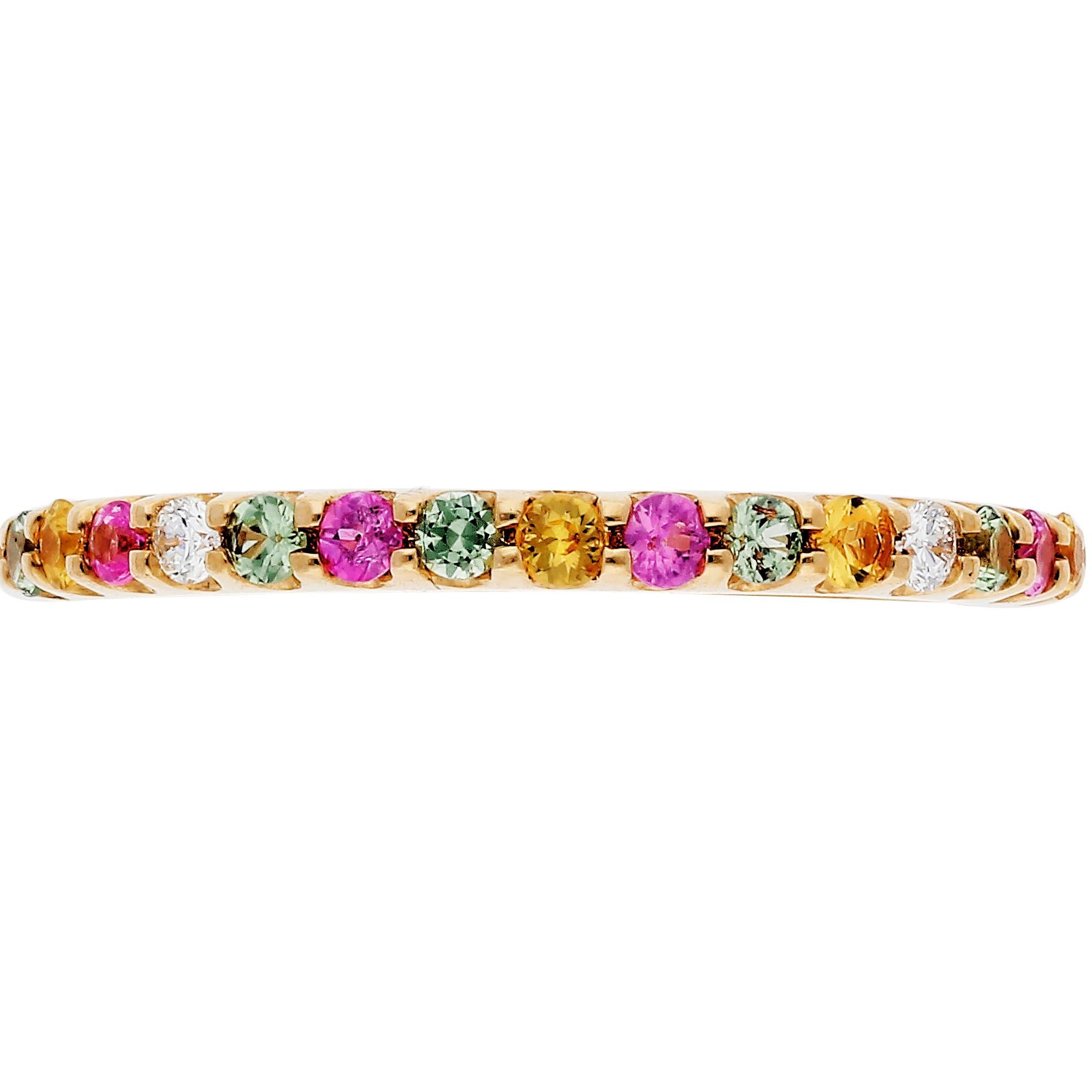 A fabulous and feminine ladies half eternity ring crafted from 18ct yellow gold and set with a delicious selection of colourful sapphires and sparkling diamonds. Something a bit different for a sapphire anniversary or September birthday.
