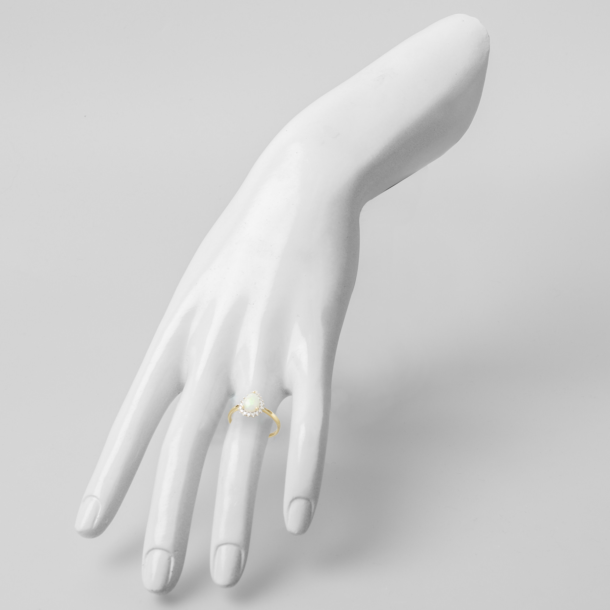 Make a statement with this gorgeous opal and diamond dress ring. A simply gorgeous gift for an Opal occasion, October birthday or self-treat! Featuring a glistening pear shaped opal cabochon set beautifully upon a yellow gold band. A fabulous right-hand ring that can be worn and enjoyed all year round. The perfect addition to any jewellery box.