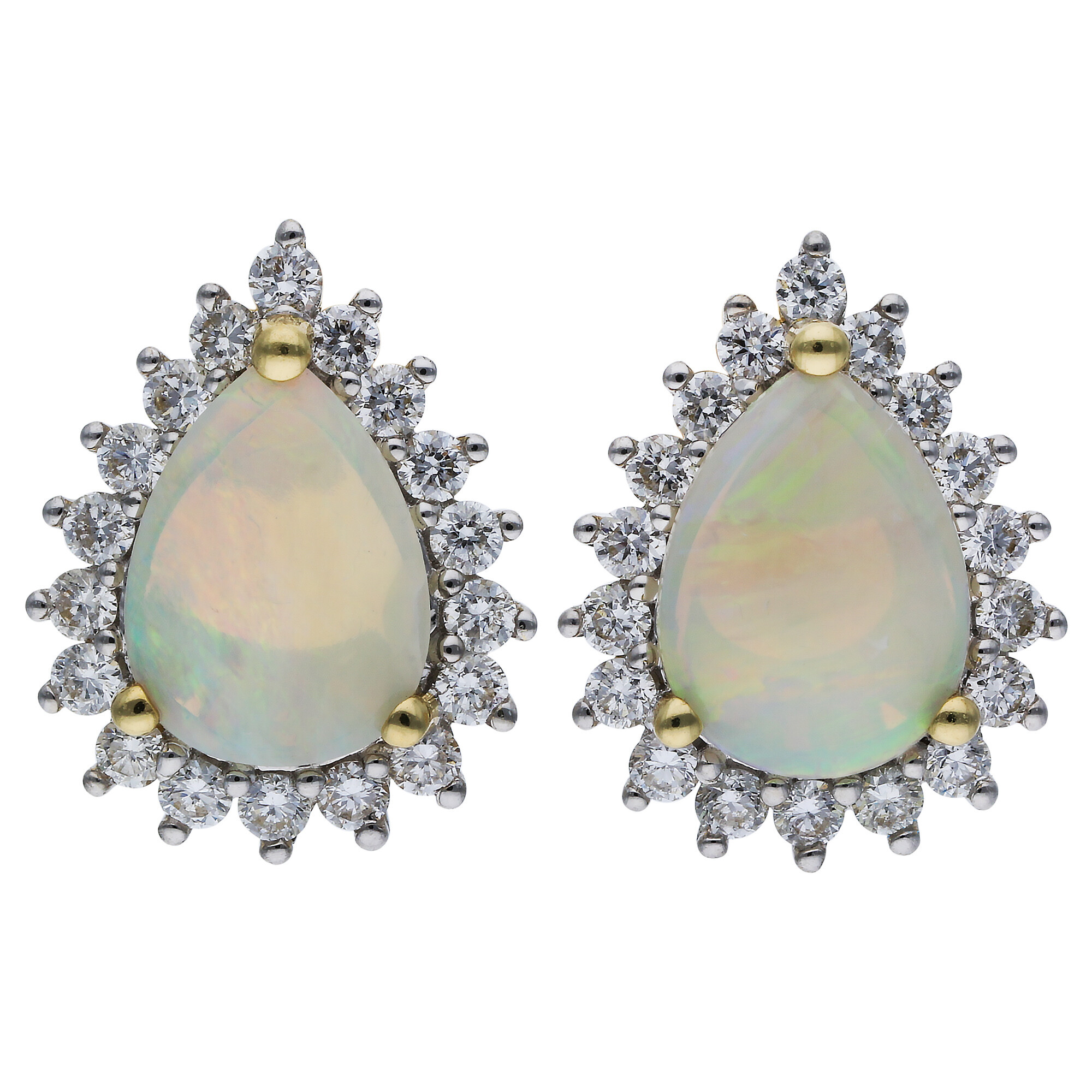 Make a statement with these gorgeous, women's opal and diamond earrings. A simply gorgeous gift for an Opal occasion, October birthday or self-treat! Each earring features a glistening pear shaped opal cabochon framed beautifully with a diamond encrusted halo and crafted in 18kt yellow gold. The perfect addition to any jewellery box.