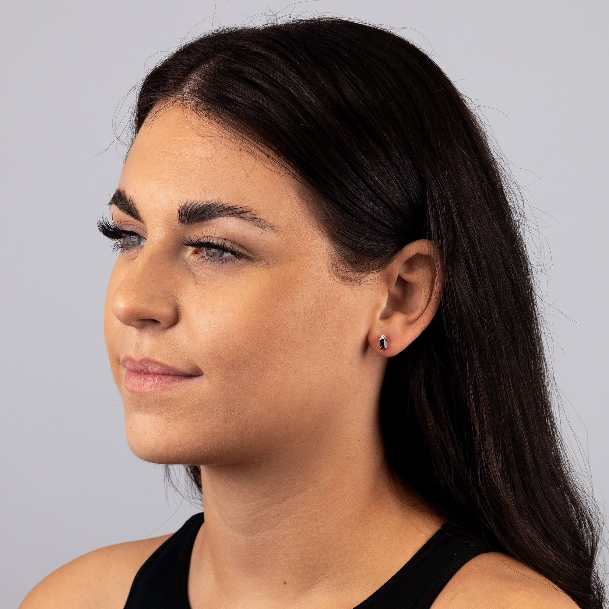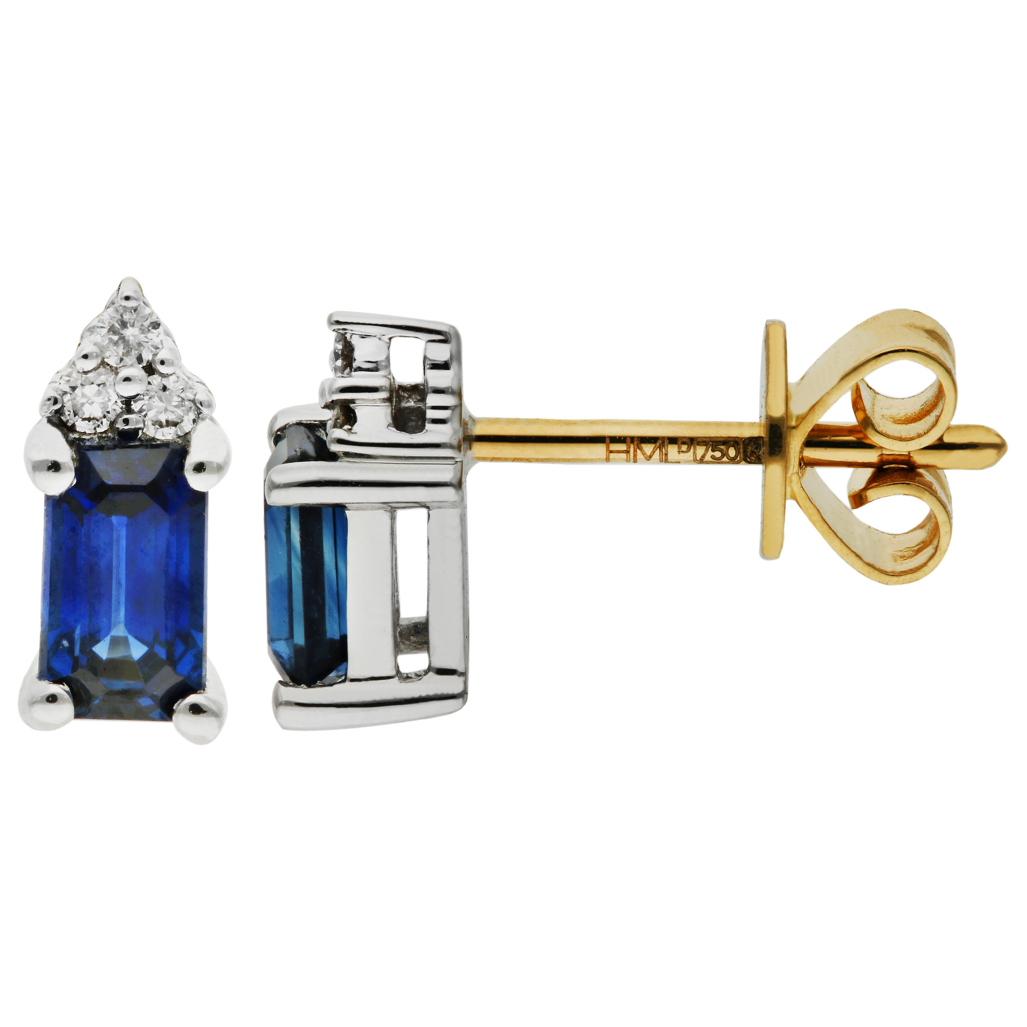 Elevate your jewellery collection with our exquisite 18ct Yellow & White Gold Diamond & 0.76ct Sapphire Earrings. Each earring features a striking rectangular-cut sapphire, securely claw-set in lustrous white gold, showcasing its vibrant deep blue hue. Above each sapphire, three tiny diamonds add a subtle sparkle, perfectly complementing the richness of the sapphire below.
